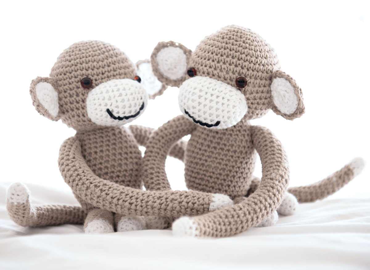 Lana Grossa Wakame (75 % Baumwolle, 25 % Viskose, Lauflänge 125 m/50 g) 50 g Grège (Fb 26), 50 g Weiß (Fb 1) und einen Rest Schwarz (Fb 9); HäkelnadelNr. 3,5; Füllwatte; 2 Augenperlen mit 10 mm Ø.