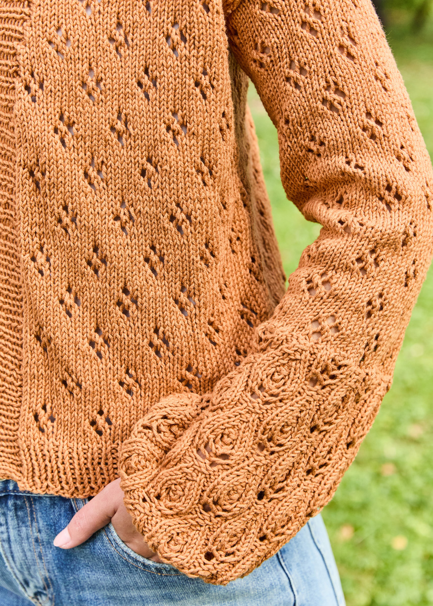 Lana Grossa-Qualität „Landlust- Baumwolle“ (100 % Baumwolle (Bio), LL ca. 115 m/50 g), 450 g (500 g - 550 g - 600 g) in Karamell (Fb 33); Stricknadeln Nr. 3,5 und Nr. 4,5, 1 Rundstricknadel Nr. 4,5, 100 cm lang.