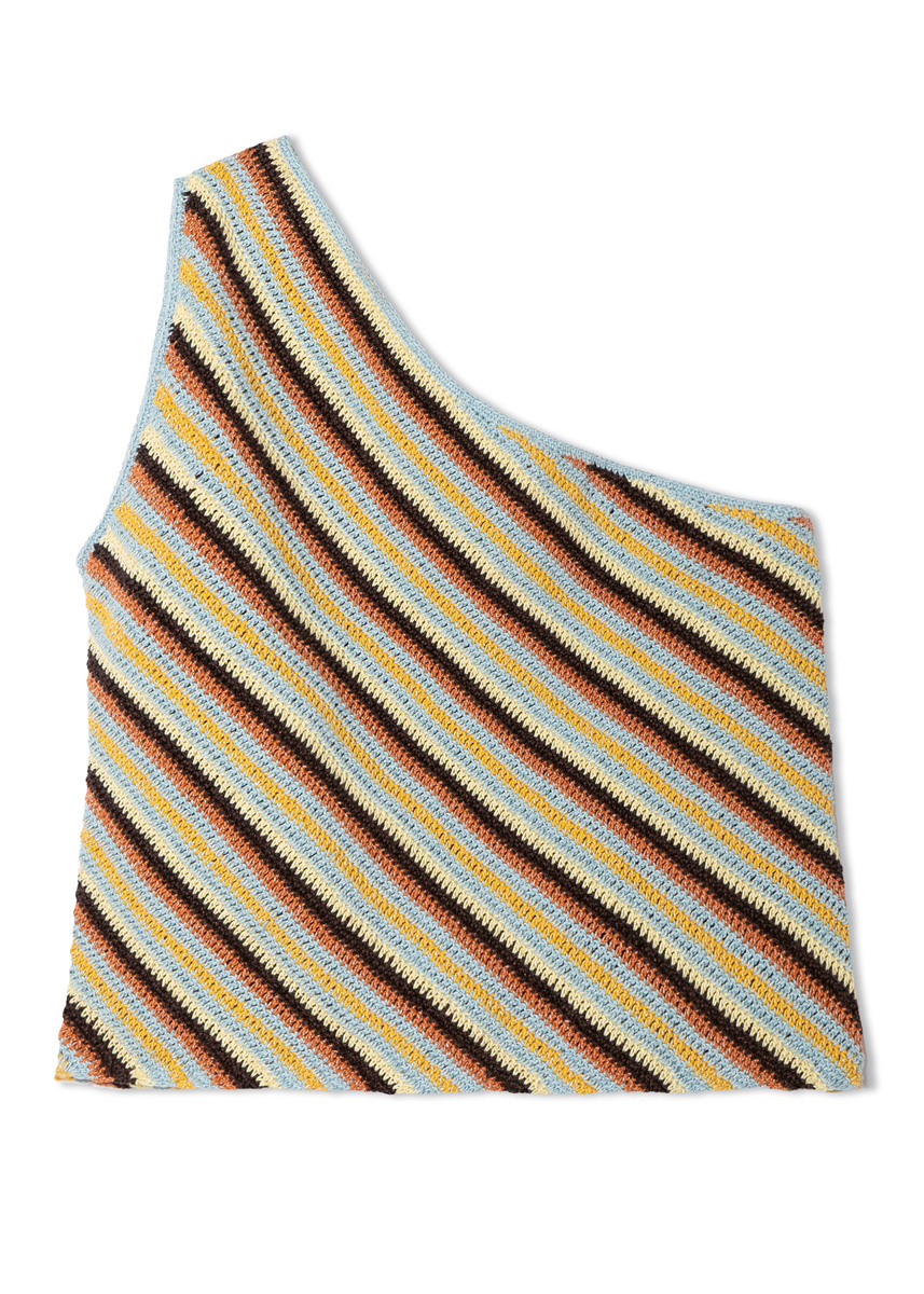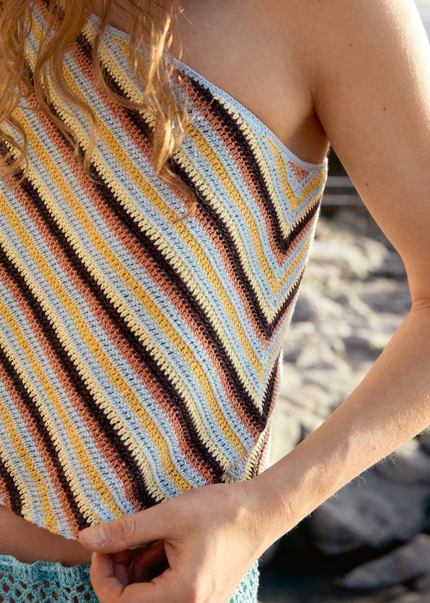 Winzig, aber wow: das asymmetrische Top aus einem neuen Baumwoll-Lurex-Gemisch. Für die diagonale Optik beginnt man unten rechts und nimmt entsprechend zu.