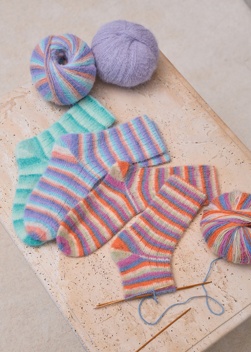 Lana Grossa-Qualität Cosy Socks Multi Stripes (70% Schurwolle (Merino), 30% Polyamid, LL = ca. 400 m/100 g): 100 g Lavendel/Graublau/Lachs/Creme/Türkis (Fb 153) oder Dunkelgrau/Graublau/Fuchsia/Lichtgrün/Creme/ Orange (Fb 154); ein Nadelspiel Nr 2,5.