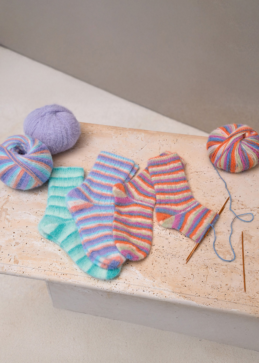 Lana Grossa-Qualität Cosy Socks Soft Stripes (70% Schurwolle (Merino), 30% Polyamid, LL = ca. 400 m/100 g): 100 g Jade/Lichtgrün/ Weißgrün/Rohweiß (Fb 102); ein Nadelspiel Nr 2,5.