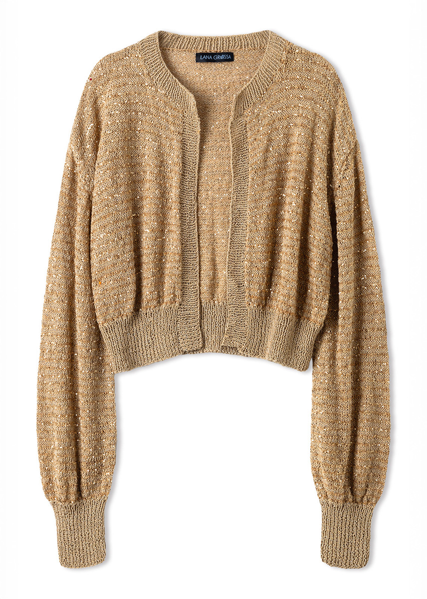 Lana Grossa-Qualität „Filo Lurex“ (95 % Baumwolle, 5 % Polyester, LL = ca 145 m/50 g): ca 300 (300 - 350 - 350) g Camel (Fb 17); Lana Grossa-Qualität „Glamour“ (55 % Polyamid, 45 % Polyester, LL = ca 115 m/25 g): ca 125 (125 - 150 - 150) g Camel (Fb 11); Stricknadeln Nr 3 und Nr 3,5.