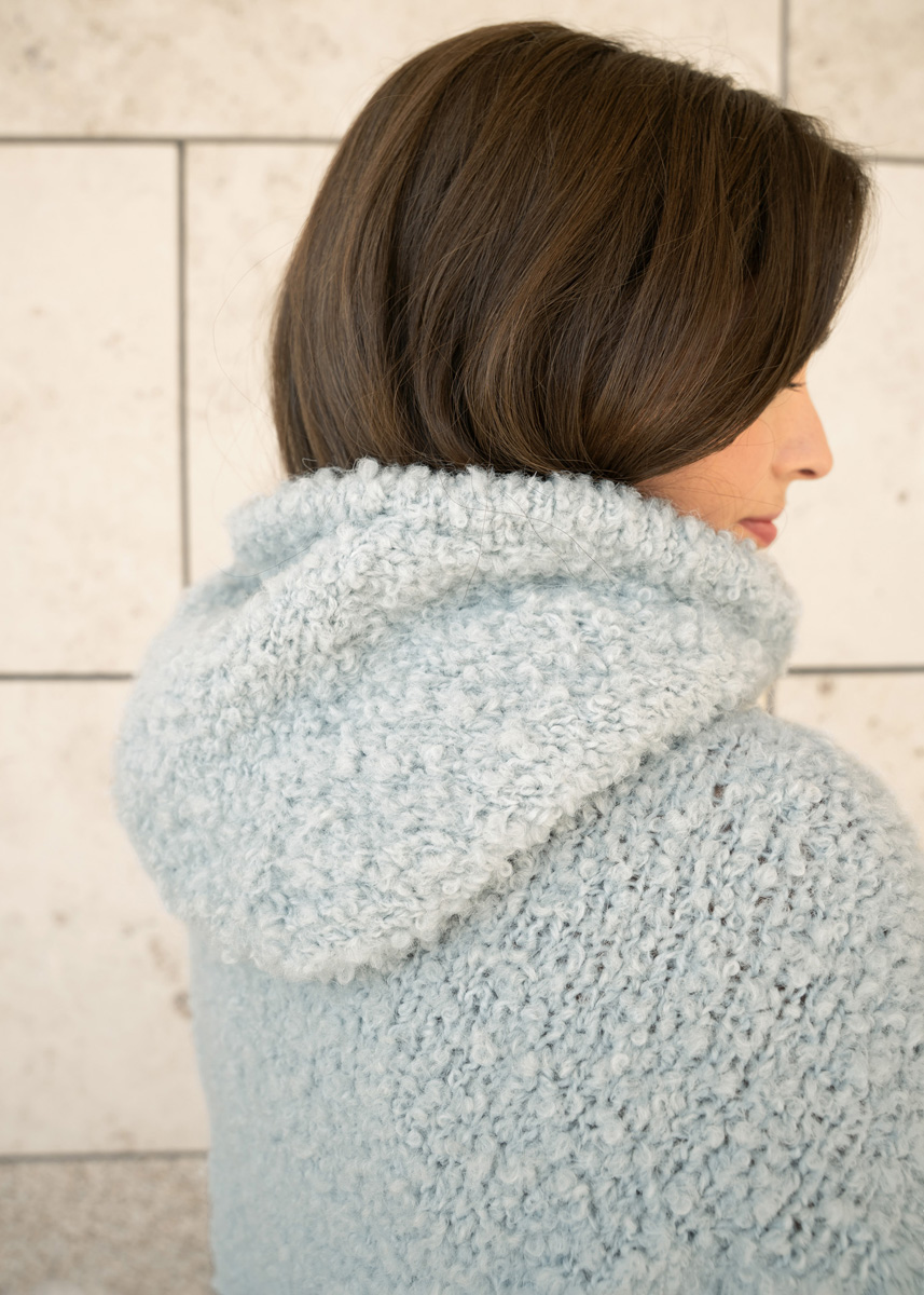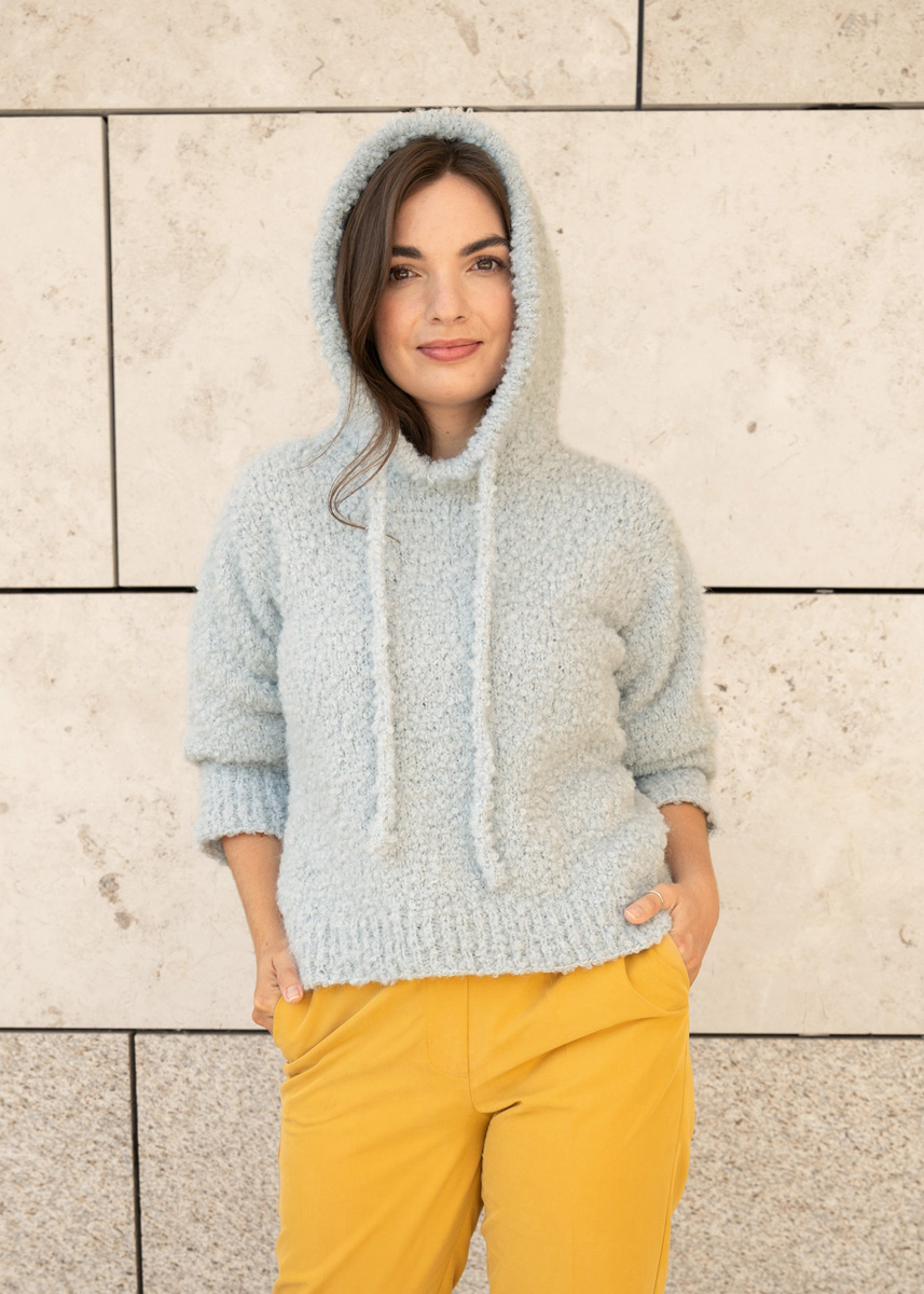 Gestartet wird mit der oberen Rückenpasse, die mittels verkürzter Reihen an die natürliche Schulterneigung angepasst wird. Seitliche Maschenaufnahmen rechts und links formen die Armausschnitte und sorgen früh für eine stabile, passgenaue Breite. Nach Erreichen der Armausschnitthöhe werden die Rückenmaschen stillgelegt. Anschließend werden die beiden Vorderteilhälften direkt an den Schultern aufgenommen und separat gearbeitet; auch hier sorgen verkürzte Reihen für die exakte Formgebung. Sobald die gewünschte Tiefe des vorderen Halsausschnitts erreicht ist, werden zwischen den Vorderteilen neue Maschen angeschlagen, die Teile verbunden und bis zur Armausschnitthöhe in Reihen weitergestrickt. Danach schließen sich Vorder- und Rückenteil zum Rumpf, der in Runden bis zur gewünschten Länge gearbeitet wird. Die Ärmel entstehen direkt aus den Armöffnungen und werden in Runden gestrickt; seitliche Abnahmen modellieren eine schlanke, harmonische Silhouette. Zum Abschluss wird eine raffinierte Kapuze separat gearbeitet. Verkürzte Reihen an den vorderen seitlichen Kapuzenteilen geben den perfekten Sitz, die Kapuze fließt sauber in den Halsausschnitt über. Mit der 3-Nadel- Abkettmethode wird die Kapuze ordentlich und flach miteinander verbunden. Optional lässt sich die Kapuze mit oder ohne Kordel versehen – als schlichtes I-Cord-Band für einen reduzierten, sportiven Look.