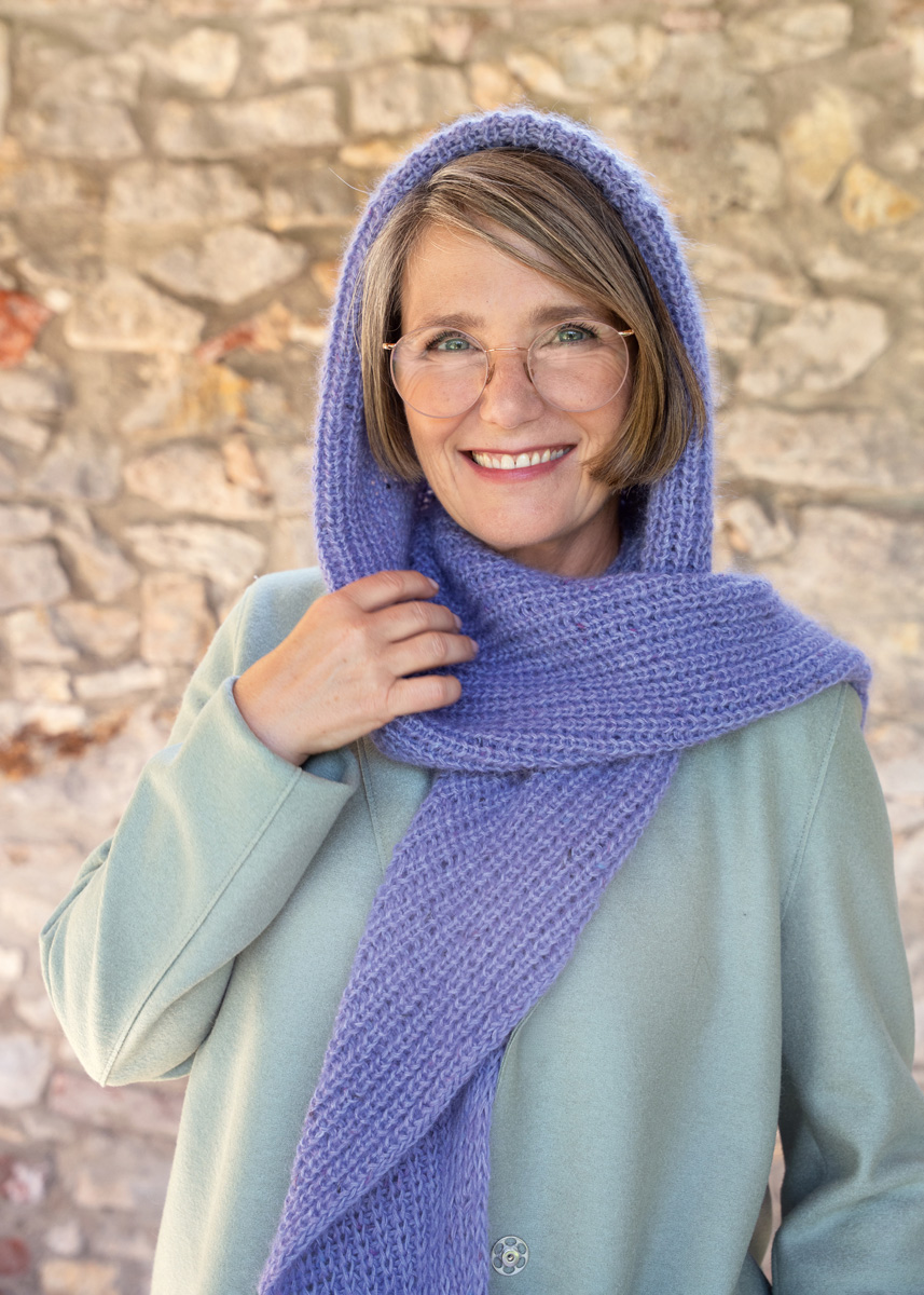 Der Cappuccio-Scarf wird nahtlos von den Schalspitzen bis zur Kapuze aufwärts gestrickt. Zunächst wird die linke Schalspitze im Halbpatentmuster mit doppelten Randmaschen an beiden Seiten und Zunahmen am rechten Rand gearbeitet. Dann werden die Maschen stillgelegt. Die rechte Schalspitze wird gegengleich mit Zunahmen am linken Rand gestrickt. Dann werden die Maschen beider Schalspitzen zusammengefasst, um über die gesamte Breite im Halbpatentmuster mit doppelten Randmaschen an beiden Seiten zu stricken. Für die obere Kapuzenrundung werden die Maschen in drei Teile geteilt, um in Hin- und Rückreihen über die Maschen des Mittelteils zu arbeiten und jeweils die letze Masche des Mittelteils mit der nächsten Masche des angrenzenden Seitenteils zusammenzustricken. Zum Schluss werden die Maschen der Kapuze mit einem schmalen Kordelrand abgekettet.