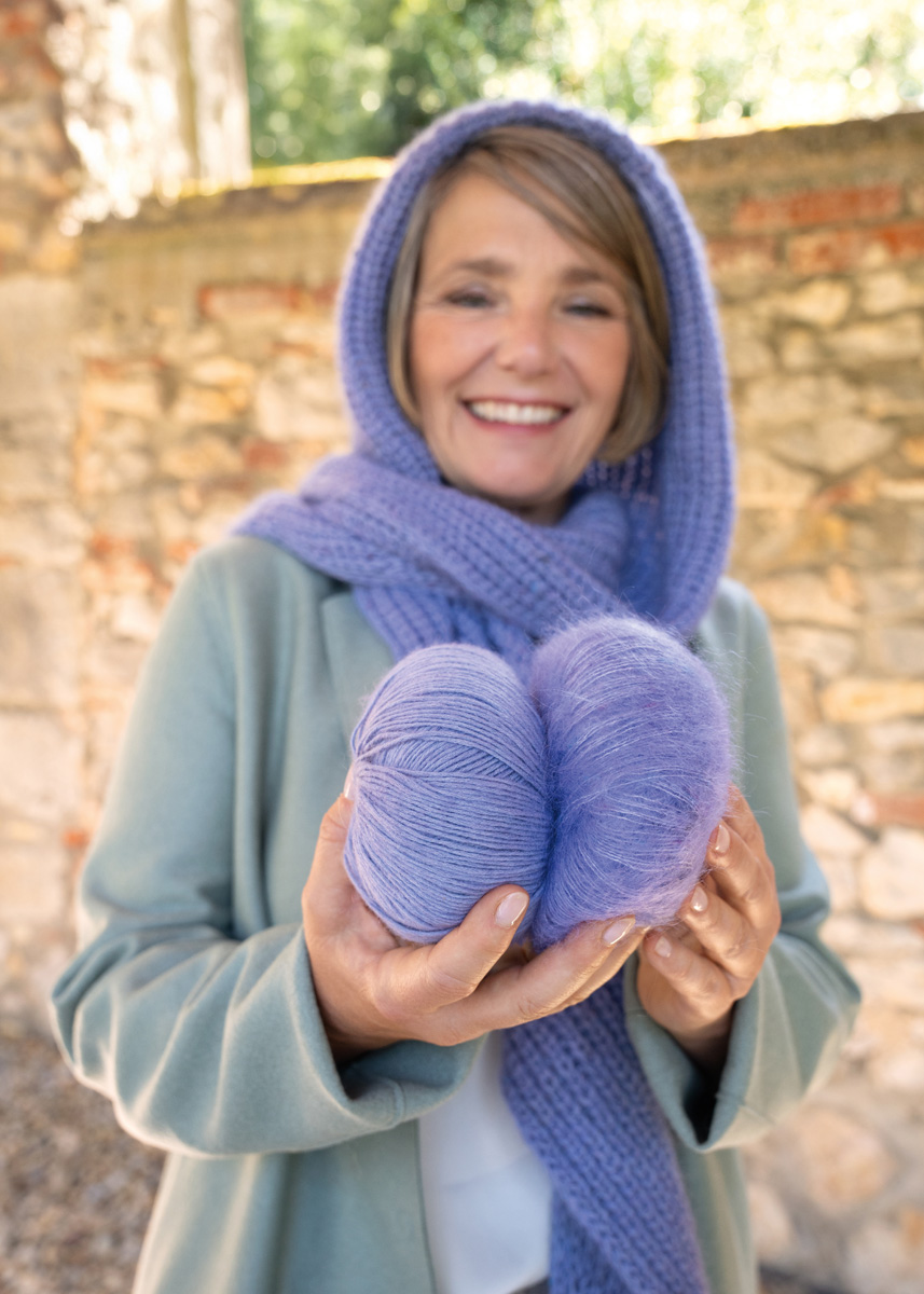 Material: Lana Grossa "Ecopuno" (72% Baumwolle, 17% Schurwolle (Merino), 11% Alpaka; LL = 215 m/50 g): 150g Lilablau (Fb.214) und Lana Grossa "Natural Superkid Tweed" (60% Mohair, 30% Seide, 7% Baumwolle, 3% Polyester; LL = 200m/25g): 75g Lila (Fb.630), 2 Rundstricknadeln 5 - 6mm, 1 Spielnadel 5 - 6 mm und Maschenmarkierer.