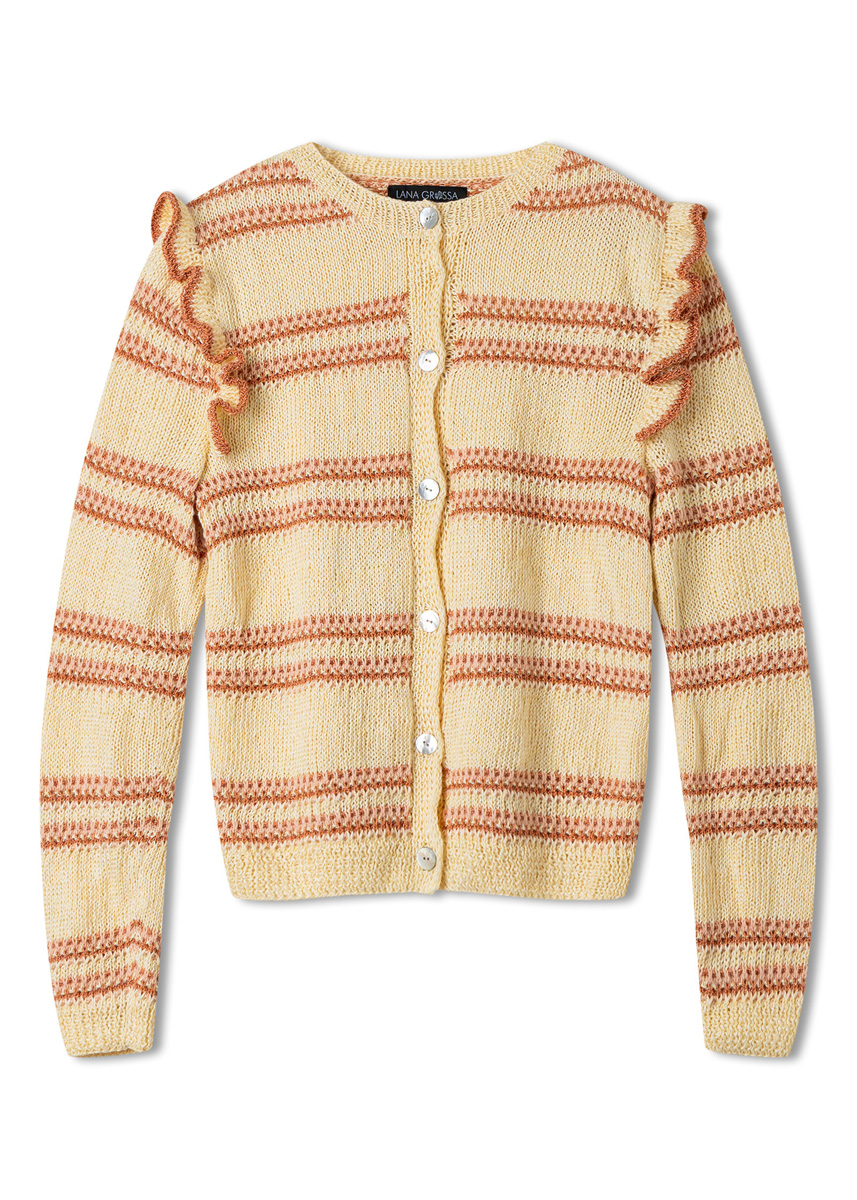 Bereit für eine zarte Romanze? Dann ist dieser zauberhafte Cardigan das Richtige für Sie! In schmeichelndem Cremeton gestrickt, setzen romantische Rüschen und fein gemusterte Streifen liebevolle Akzente. Zarte Perlmuttknöpfe runden den mädchenhaften Look ab.