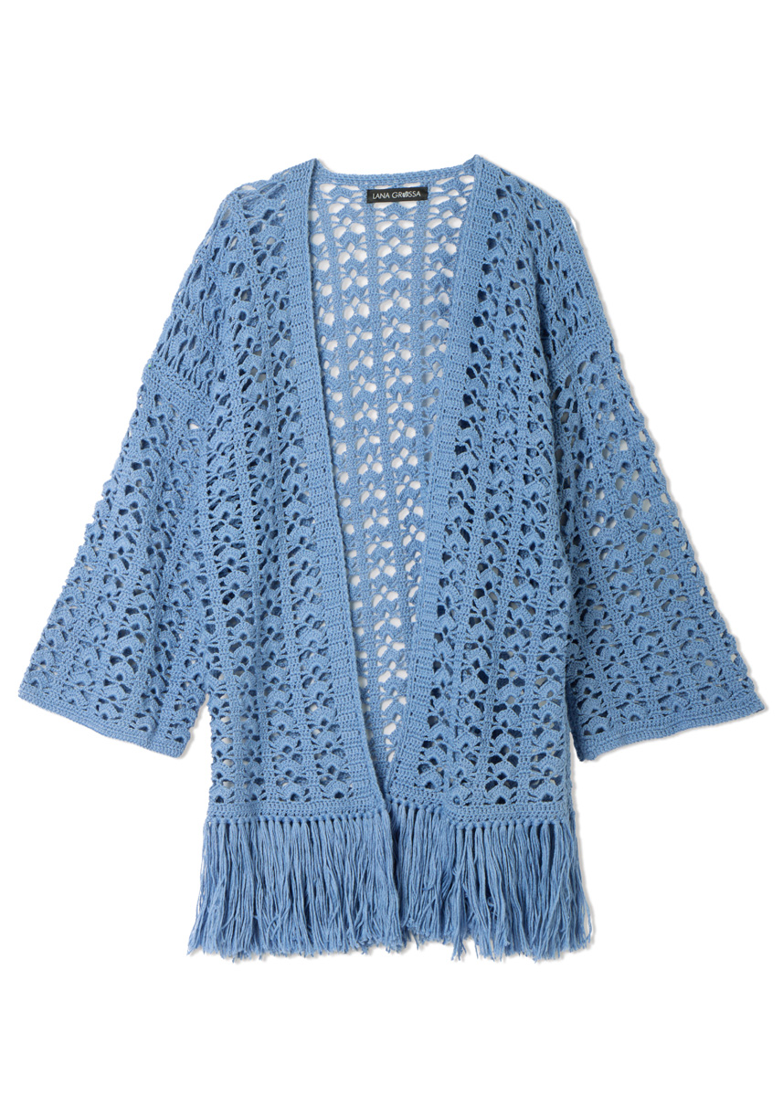 Lana Grossa-Qualität „Summer Cashmere” (90 % Baumwolle, 10 % Kaschmir, LL = ca. 210 m/50 g): ca. 450 g Bergblau (Fb. 21); je 1 Wollhäkelnadel Nr. 3 und 5, zum Einknüpfen der Fransen.