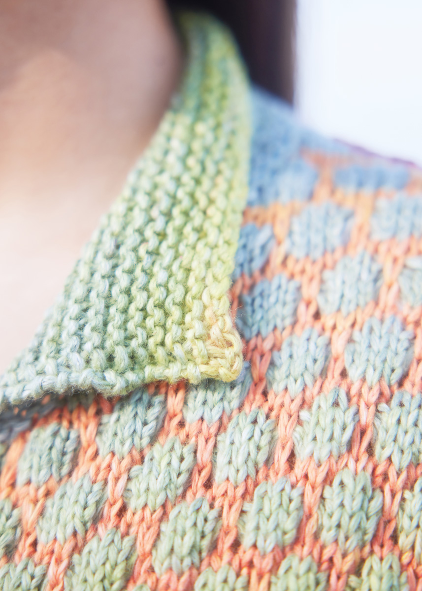 Lana Grossa-Qualität „Cotonella“ (100% Baumwolle (Pima), LL = ca 280 m/100 g): 3 (3 - 4 - 4) Knäuel = ca 300 (300 - 400 - 400) g Gelbgrün/Rot/Weinrot/Fuchsia/ Rotviolett/Lila/Beige (Fb 2) und 2 (2 - 3 - 3) Knäuel = ca 200 (200 - 300 - 300) g Apricot/Lachsorange/Orange/Gelb-/ Dunkel-/Schwarzgrün/Nussbraun (Fb 6); Stricknadeln Nr 4 und Nr 4,5.