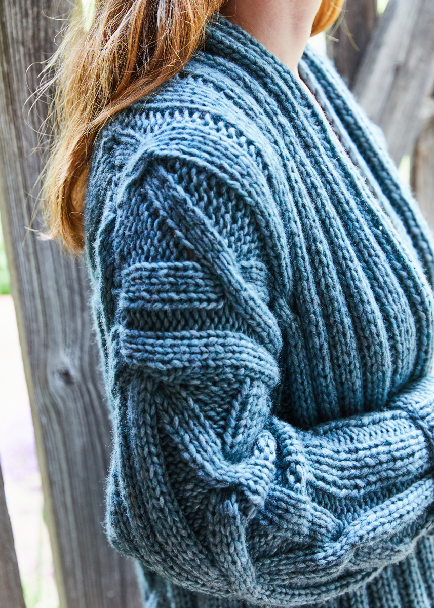 Lana Grossa-Qualität „Landlust Winterwolle“ (50% Schurwolle Merino, 35% Baumwolle, 15% Yak, LL ca. 70 m/50 g), 750 (850) g Petrol Meliert (Fb 13); Stricknadeln Nr. 8 und Nr. 9, 1 Hilfs- oder Zopfnadel, 1 Häkelnadel Nr. 6.
