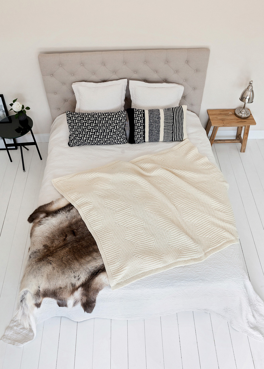 Für das Plaid im Mustermix braucht man etwas Geduld. Dafür ist es schön zeitlos und ergänzt das Kissen-Duo ganz wunderbar.