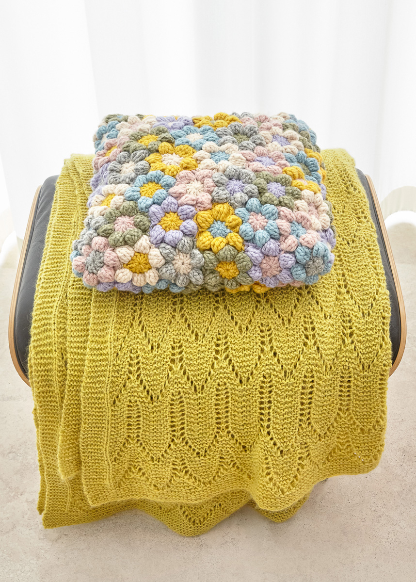 Häkelnoppen, dicht an dicht aneinandergehäkelt, ergeben dieses Blütenkissen. Hübsch dazu: Das kraus gestrickte Ajourmuster-Plaid aus kuschlig-leichtem Alpaka-Mix.