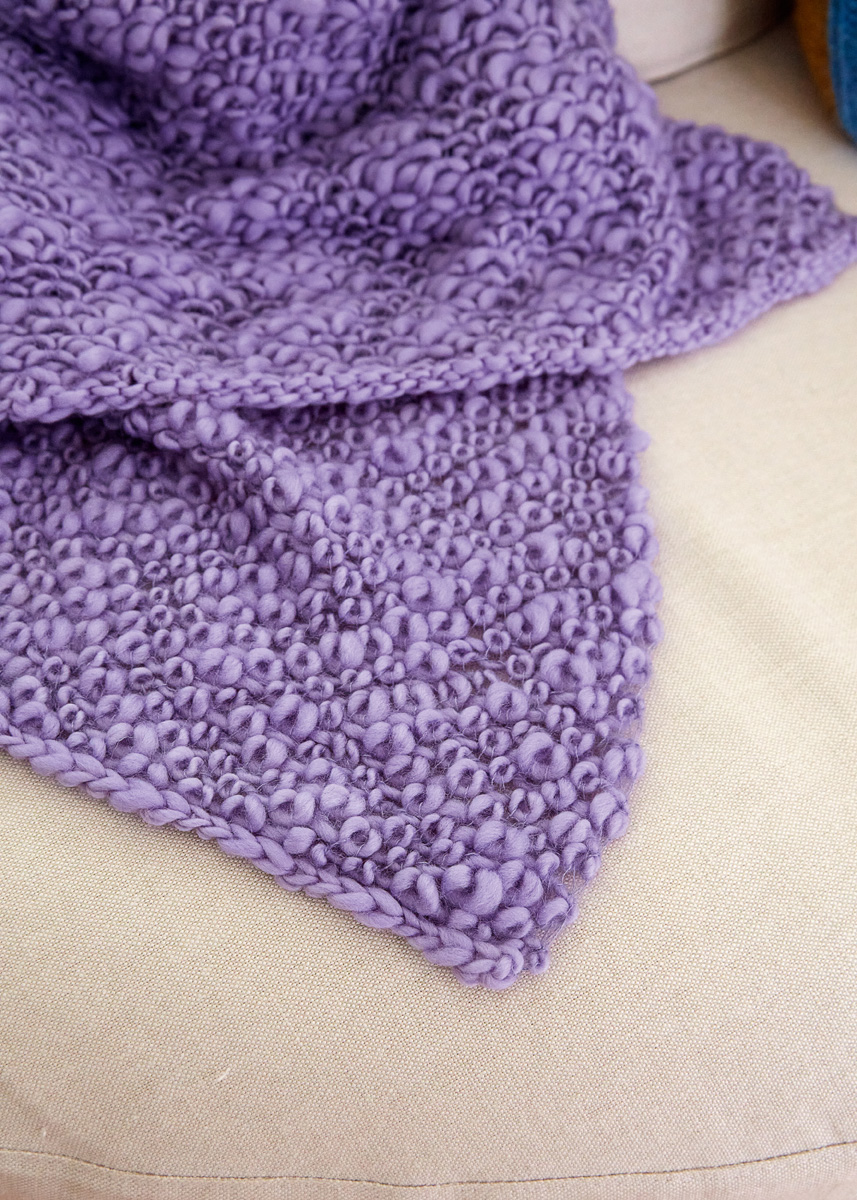 Lana Grossa-Qualität „Lala Berlin Flamy” (100 % Schurwolle (Merino), LL = ca. 70 m/100 g): ca. 700 g Flieder (Fb. 11) und Lana Grossa- Qualität „Silkhair” (70 % Mohair (Superkid), 30 % Seide, LL = ca. 210 m/25 g): ca. 75 g Violett (Fb. 188); je 1 Rundstricknadel Nr. 8 und 9, 120 cm lang.