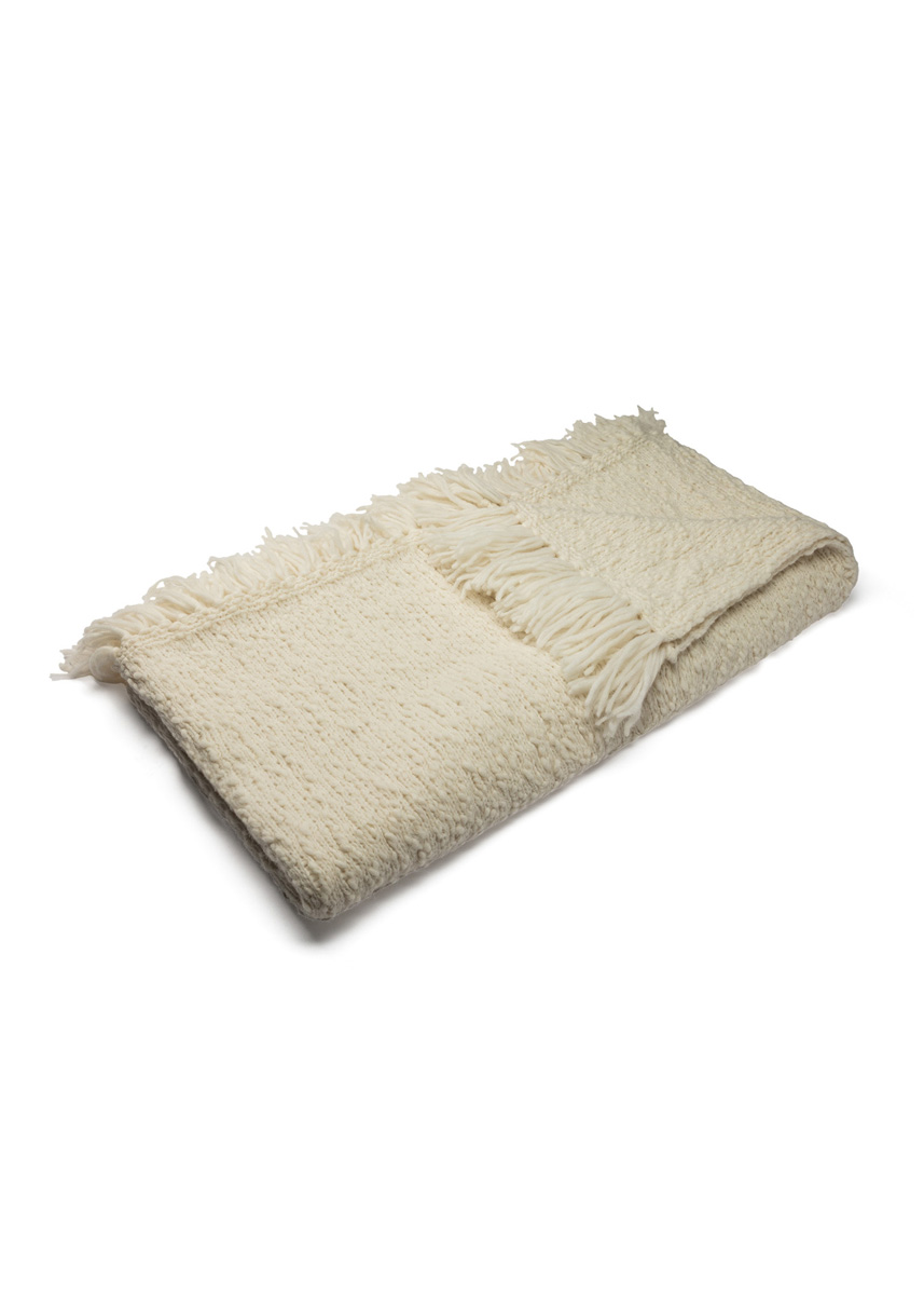 Lana Grossa-Qualität „Caramella” (53 % Schurwolle (Merino), 25 % (Baby) Alpaka, 22 % Polyamid, LL = ca. 110 m/50 g): ca. 950 g Weiß (Fb. 11); 1 Rundstricknadel Nr. 5,5, 120 cm lang, 1 Wollhäkelnadel Nr. 7 zum Einziehen der Fransen.
