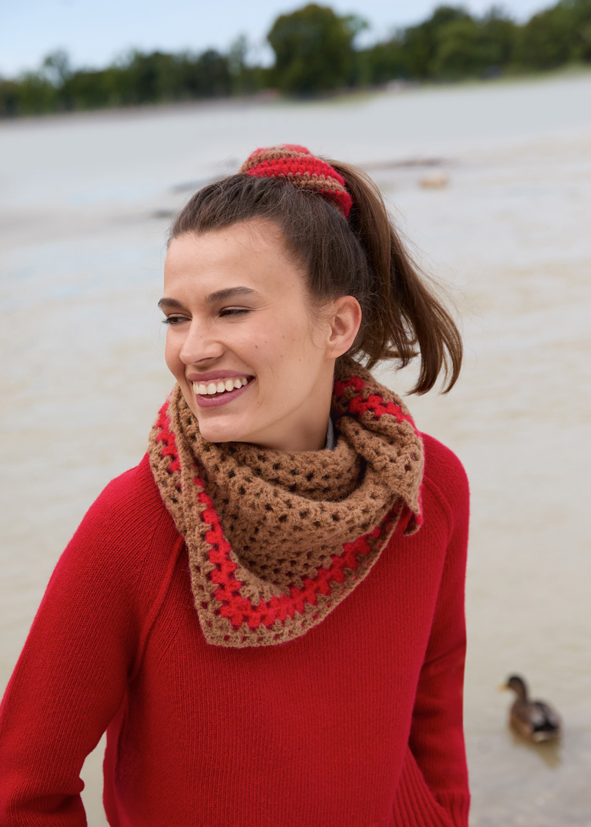 Lana Grossa „Nebbia“ (55% Schurwolle (Merino extrafine), 45% (Baby) Alpaka, LL = 170 m/50 g): je 100 g Leuchtendrot (Fb 2) und Camel (Fb 12); 1 Häkelnadel Nr 4,5.