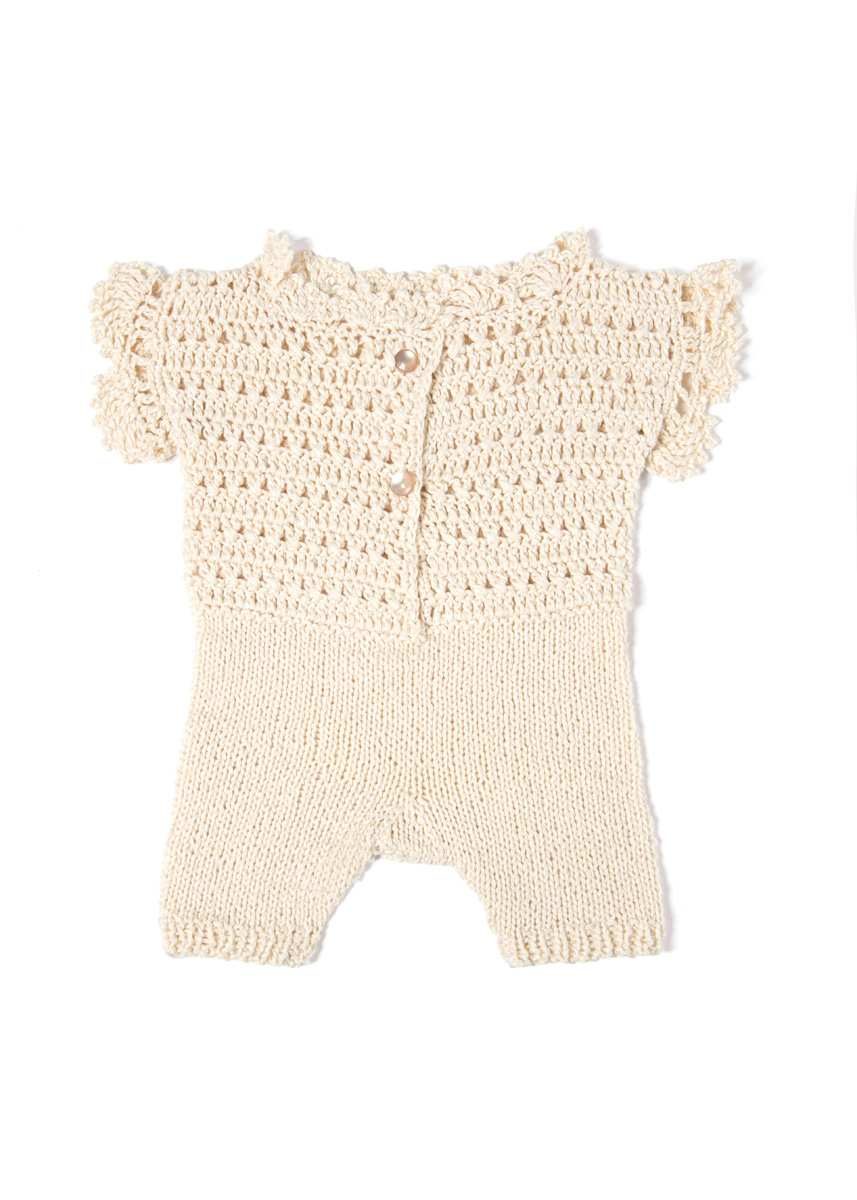 Lana Grossa Summer Cashmere (90% Baumwolle, 10% Kaschmir; LL = 210 m/50 g): 100 (100) g in Creme (Fb. 2); ein Nadelspiel 3,5 mm; eine Rundstricknadel 3,5 mm; eine Häkelnadel 3 mm; 2 Knöpfe mit 12 mm Ø.