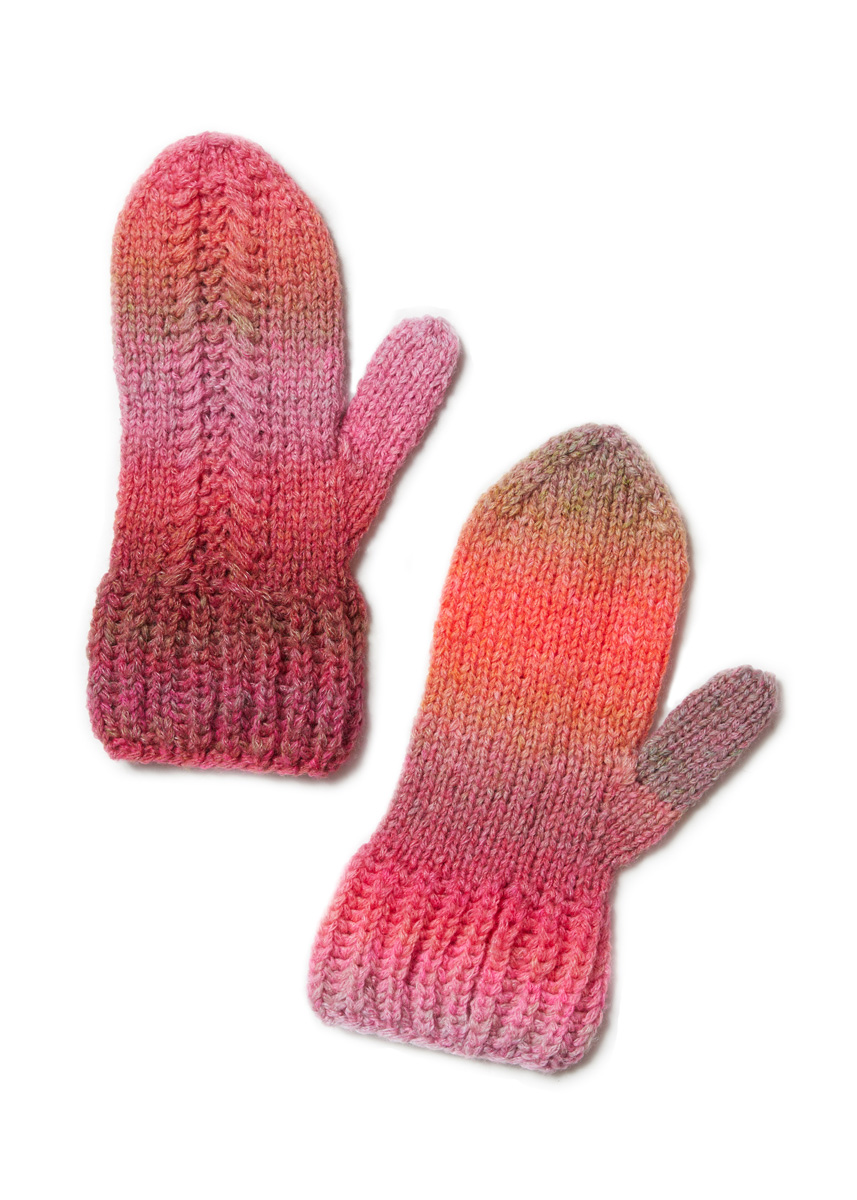 Lana Grossa „Pappagallo“ (90% Schurwolle ((Merino extrafine), 10% Polyamid, Lauflänge 250 m/100 g), 100 g Pink/Braunrot/ Koralle/Himbeer (Fb. 11); 1 Nadelspiel Nr. 6.