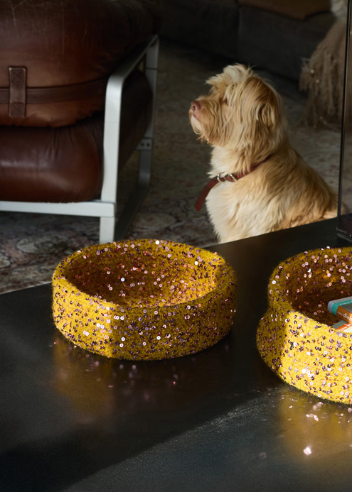 Lana Grossa-Qualität „Feltro” (100 % Schurwolle, LL = ca. 50 m/50 g): kleine Schale: ca. 400 g Senf (Fb. 125) und Lana Grossa-Qualität „Cosmo” (100 % Baumwolle (plus Pailletten), LL = ca. 260 m/100 g): große und kleine Schale: je ca. 100 g Altrosa (Fb. 14); 1 Wollhäkelnadel Nr. 7.