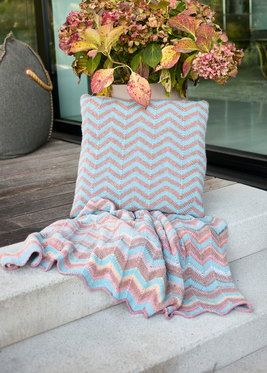 Lana Grossa-Qualität „Gomitolo Intenso” (50 % Schurwolle, 50 % Polyacryl, LL = ca. 700 m/200 g): ca. 400 g Hellgrau/Apricot/Blassgelb/ Zartblau/Zartrosa/Grau/Grège/ Pfirsich (Fb. 236) und Lana Grossa- Qualität „Brigitte No. 2” (47 % (Baby) Alpaka, 45 % Baumwolle, 8 % Schurwolle (Merino), LL = ca. 140 m/50 g): je ca. 200 g Türkisblau (Fb. 77) und Rosenholz (Fb. 43); 1 Rundstricknadel Nr. 5, 120 cm lang.