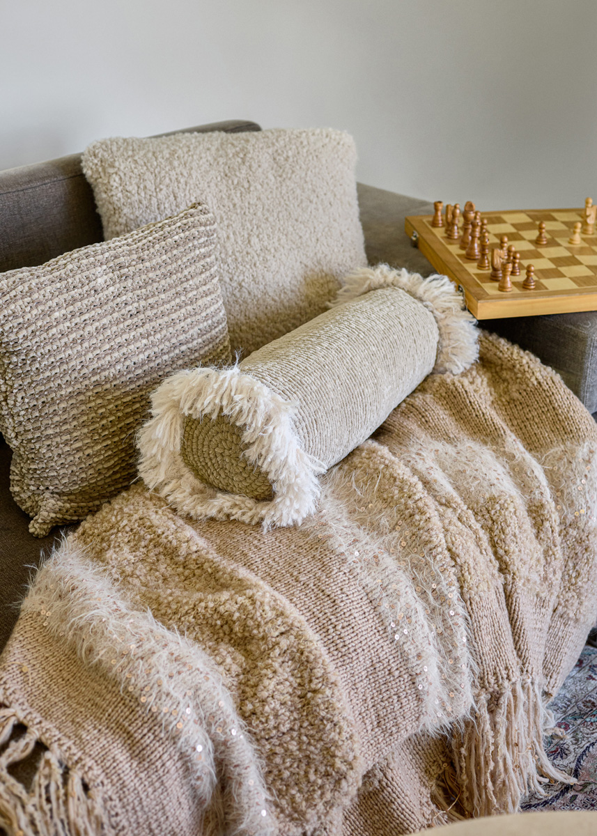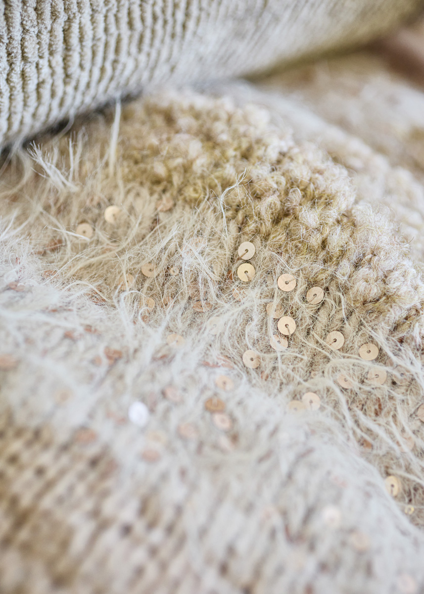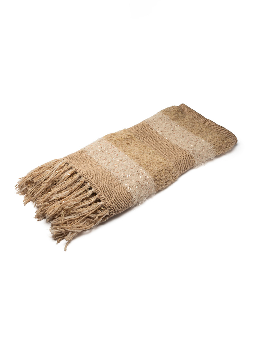 Lana Grossa-Qualität „Winter Softness” (62 % Schurwolle (Merino extrafine), 38 % (Bio) Baumwolle, LL = ca. 70 m/50 g): ca. 500 g Beige (Fb. 18), Lana Grossa- Qualität „Basta” (50 % Schurwolle (Merino), 50 % Polyamid, LL = ca. 100 m/50 g): ca. 250 g Beige (Fb. 3), Lana Grossa-Qualität „Cosmo” (100 % Baumwolle (plus Pailletten), LL = ca. 260 m/100 g): ca. 300 g Sandbeige (Fb. 10) und Lana Grossa- Qualität „Orsetto” (60 % Schurwolle (Merino), 40 % Alpaka (superfine), LL = ca. 75 m/50 g): ca. 350 g Beige (Fb. 6); 1 Rundstricknadel Nr. 7, 120 cm lang, 1 Wollhäkelnadel Nr. 8 zum Einziehen der Fransen.