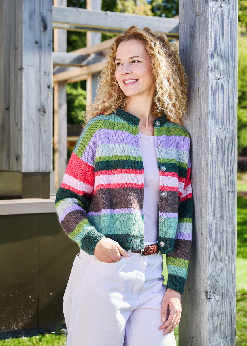Lana Grossa-Qualität „Landlust- Alpaka-Merino 160“ (50 % Schurwolle (Merino), 50 % Alpaka (Baby), LL ca. 160 m/50 g), 100 g (150 g -150 g) in Moosgrün (Fb 423), je 50 g (100 g - 100 g) in Graubraun (Fb 405), in Hummer (Fb 441) und in Schilfgrün (Fb 432), und je 50 g in Flieder (Fb 440), in Rosa (Fb 413), in Hellgrau (Fb 407) und in Kiwigrün (Fb 443) und „Landlust-Kidmohair“ (70 % Mohair Superkid, 30 % Baumwolle, LL ca. 225 m/25 g), je 50 g in Petrolgrün (Fb 5), in Graubraun (Fb 19), in Himbeerrot (Fb 11) und in Mintgrün (Fb 6), in Graulila (Fb 13), in Zartrosa (Fb 16), in Hellgrau (Fb 17) und in Grün (Fb 4); Stricknadeln Nr. 4 und Nr. 4,5, 1 Rundstricknadel Nr. 4, 50 cm lang, 6 transparente Druckknöpfe zum Annähen, 20 mm ø.