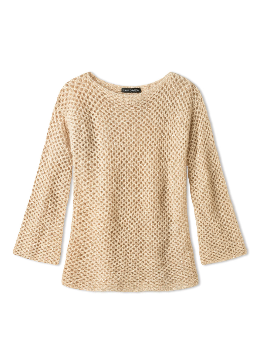 Lana Grossa-Qualität „Setasuri“ (69 % Alpaka (Suri), 31 % Seide, LL = ca 212 m/25 g): ca 150 (150 - 175 - 175) g Hellbeige (Fb 58); Lana Grossa-Qualität „Glamour“ (55 % Polyamid, 45 % Polyester, LL = ca 115 m/25 g): ca 250 (275 - 300 - 325) g Beige (Fb 10); Häkelnadel Nr 4.