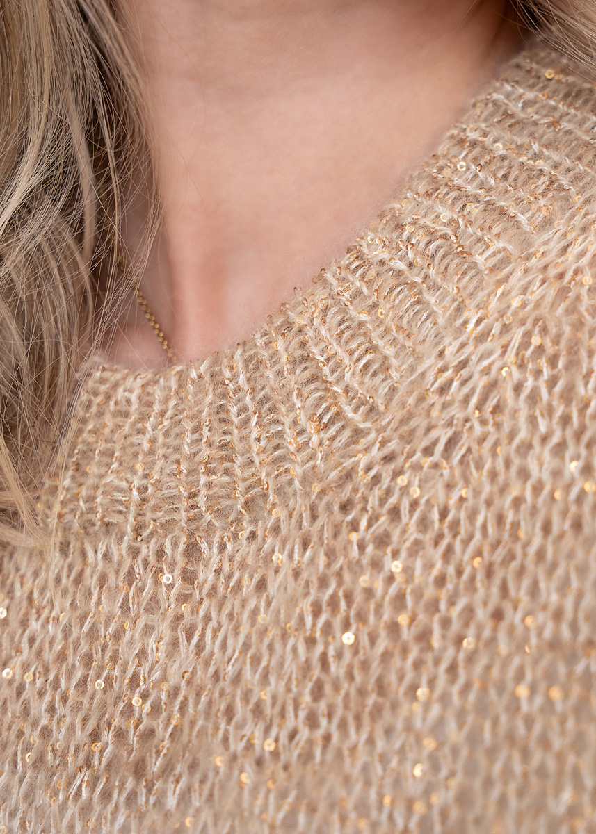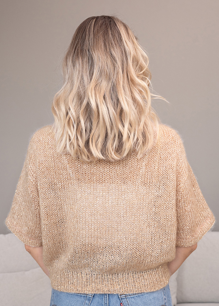 Das GlamShirt wird nahtlos top-down von oben nach unten gestrickt. Zunächst werden Maschen für das Rückenteil angeschlagen und in Hin- und Rückreihen begonnen. Die Schulterschrägen werden an beiden Seiten mithilfe verkürzter Reihen geformt. Anschließend wird über alle Maschen gerade herabgestrickt, bis die Armausschnitthöhe erreicht ist.