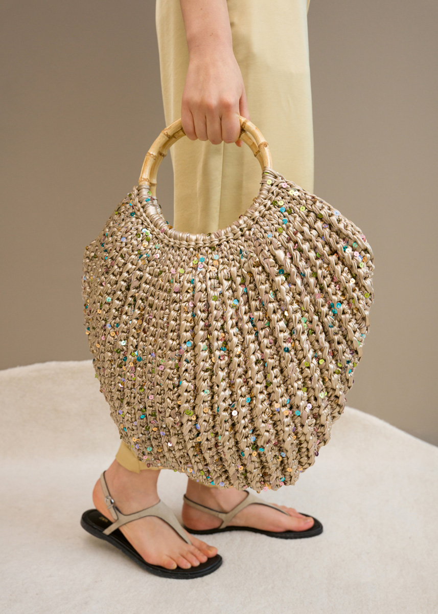 Lana Grossa „The Loop“ (100% Polyester, LL = 40 m/100 g): 800 g Goldbraun (Fb 4) und Lana Grossa „Cosmo“ (100% Baumwolle (plus Pailletten), LL = 260 m/100 g): 100 g Hellbeige (Fb 11); Häkel-Nd Nr 8; Maschenmarkierer; 1 Paar Bambusgriffe ø 17,5 cm (außen).