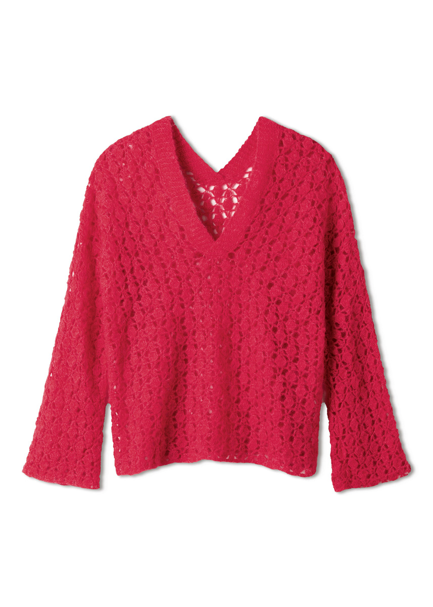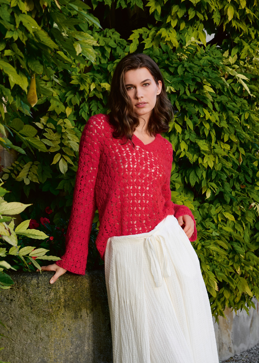 Lana Grossa-Qualität „Setasuri“ (69 % Alpaka (Suri), 31 % Seide, LL = ca 212 m/25 g): ca 175 (200 - 225) g Himbeer (Fb 68); Häkelnadel Nr 3,5 und Nr 4.