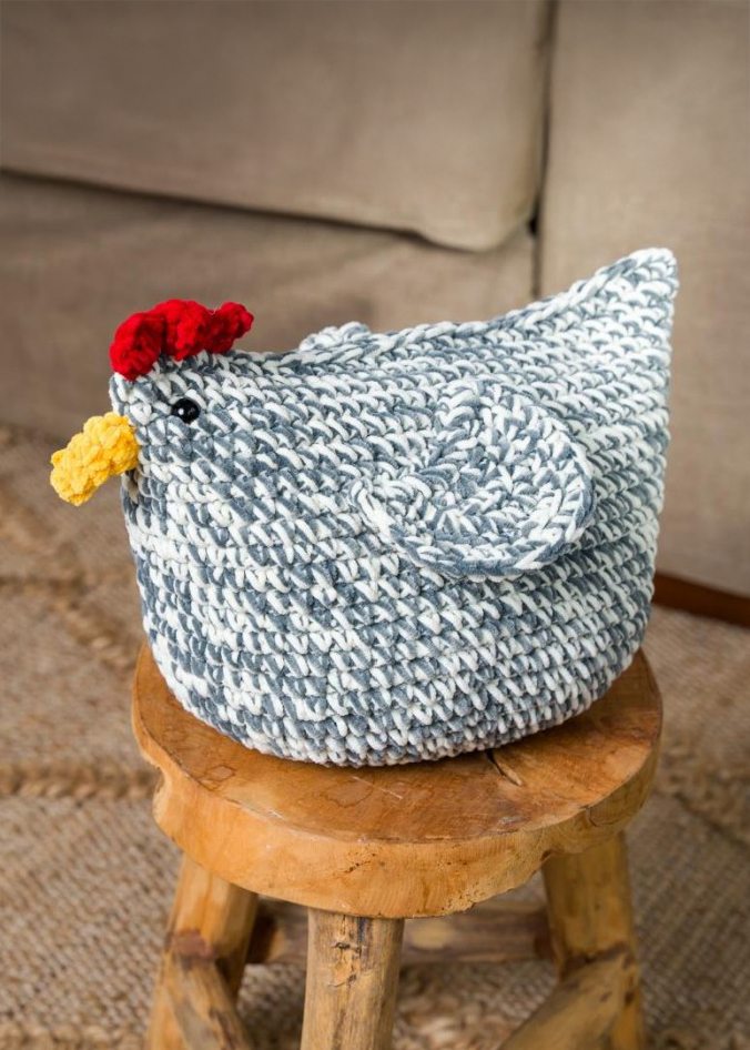 Für den besonderen Farbeffekt wird das weiche Chenillegarn 2- fädig verarbeitet. Für ein Huhn benötigst du 200 g Lana Grossa The Look Fine (100 % Polyester, Lauflänge: ca. 100 m / 50 g), je 100g in Grau (Farbe 125) und Natur (Farbe 102), sowie Reste in Rot (Fb 107) für den „Kamm“ und Gelb (Farbe 104) für den „Schnabel“. Wollhäkelnadel Nr. 6 mm, Wollsticknadel, Schere, 150-200g Füllwatte, für die Augen ein Wollrest in dunkler Farbe oder entsprechende Sicherheitsknöpfe, Durchmesser ca. 10 mm