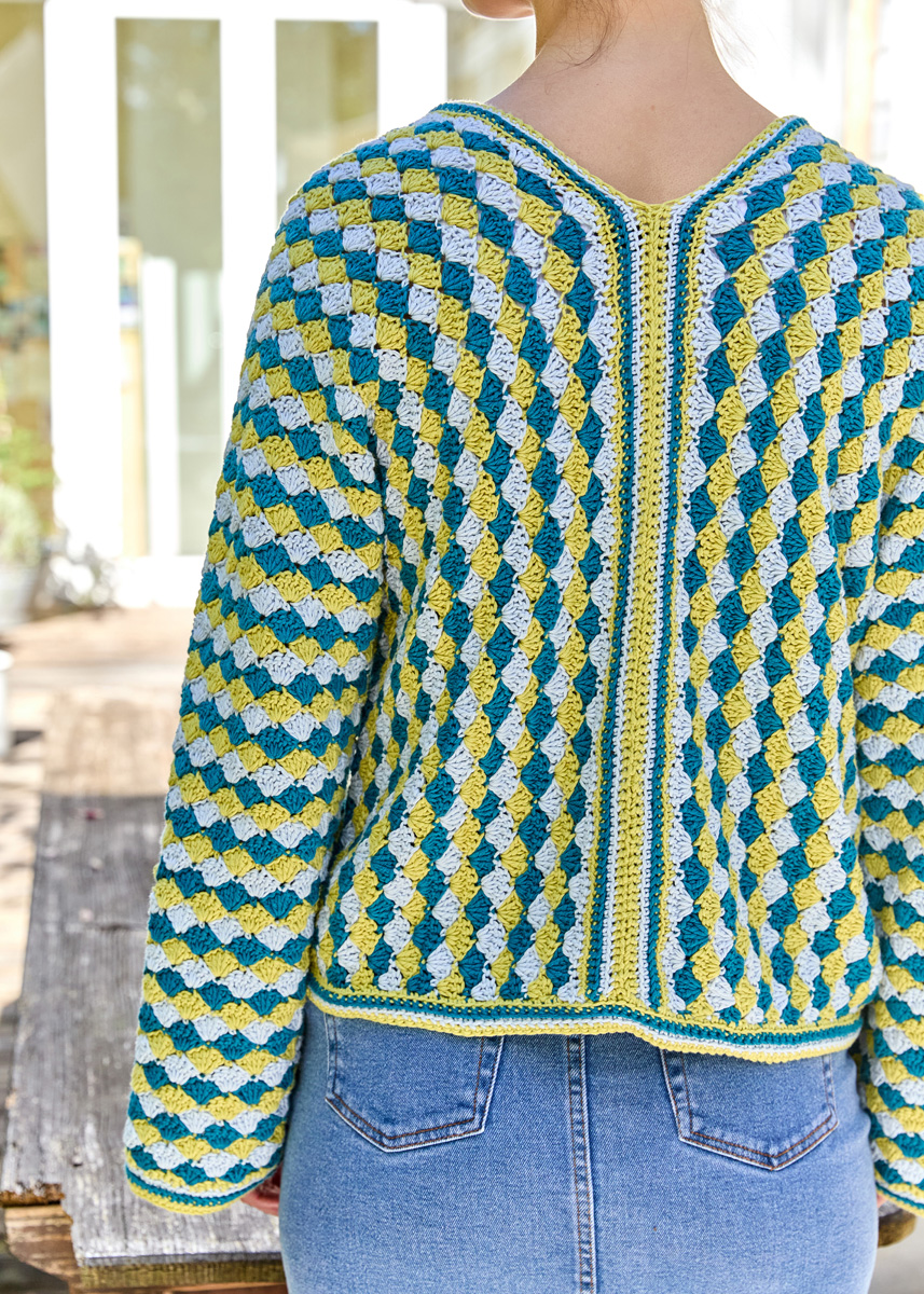 Die Jacke wird in 2 Teilen quer gehäkelt, dabei jeweils an den Ärmeln beginnen.
