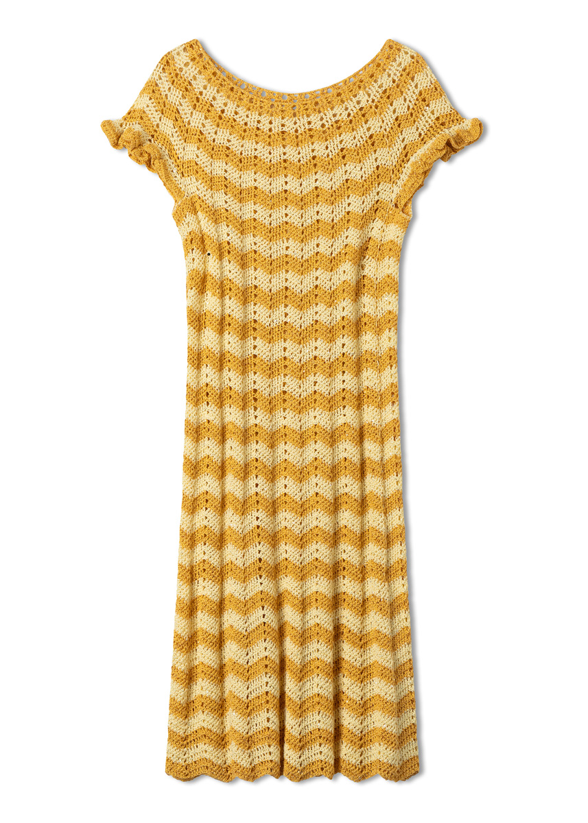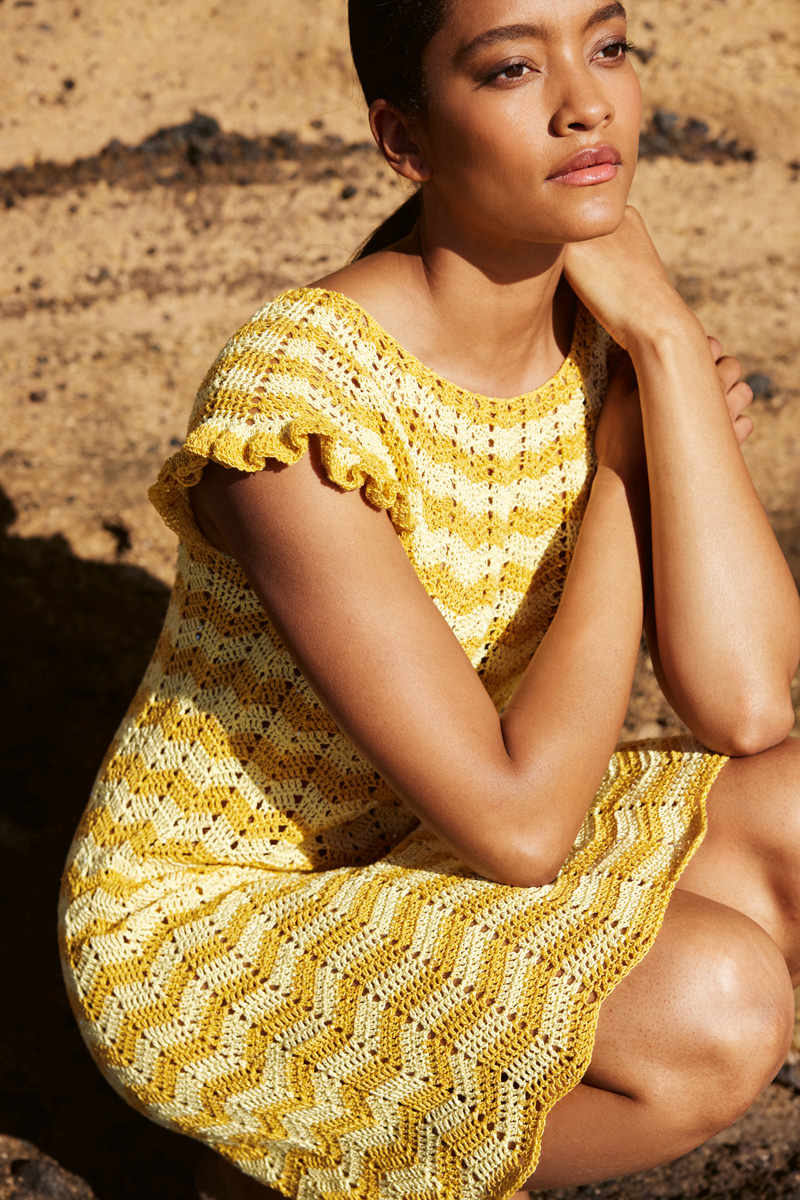 Verspielte Rüschen und ein figurbetonter Schnitt: Bei diesem femininen, top-down gearbeiteten Häkelkleid hat unser neues Garn seinen funkelnden Soloauftritt. Und weil auch Girlies erwachsen werden, mixen wir den mädchenhaften Look mit der strengen Symmetrie von Zickzackstreifen.