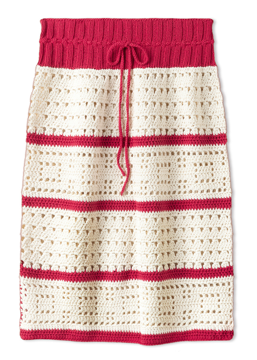 Lana Grossa-Qualität „Promessa“ (70 % Baumwolle (Bio), 30 % Polyamid (Recycled), LL = ca 125 m/50 g): ca 350 (450) g Creme (Fb 14) und ca 100 (150) g Orientrot (Fb 1); Häkelnadel Nr 5; 1 kürzere Rundstricknadel Nr 3,5.