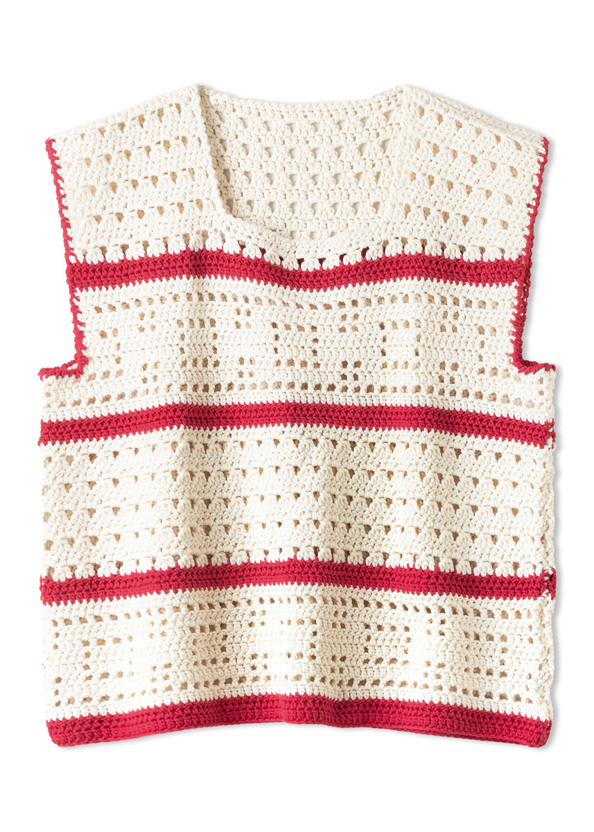 Lana Grossa-Qualität „Promessa“ (70 % Baumwolle (Bio), 30 % Polyamid (Recycled), LL = ca 125 m/50 g): ca 250 (350) g Creme (Fb 14) und ca 50 (100) g Orientrot (Fb 1); Häkelnadel Nr 5.