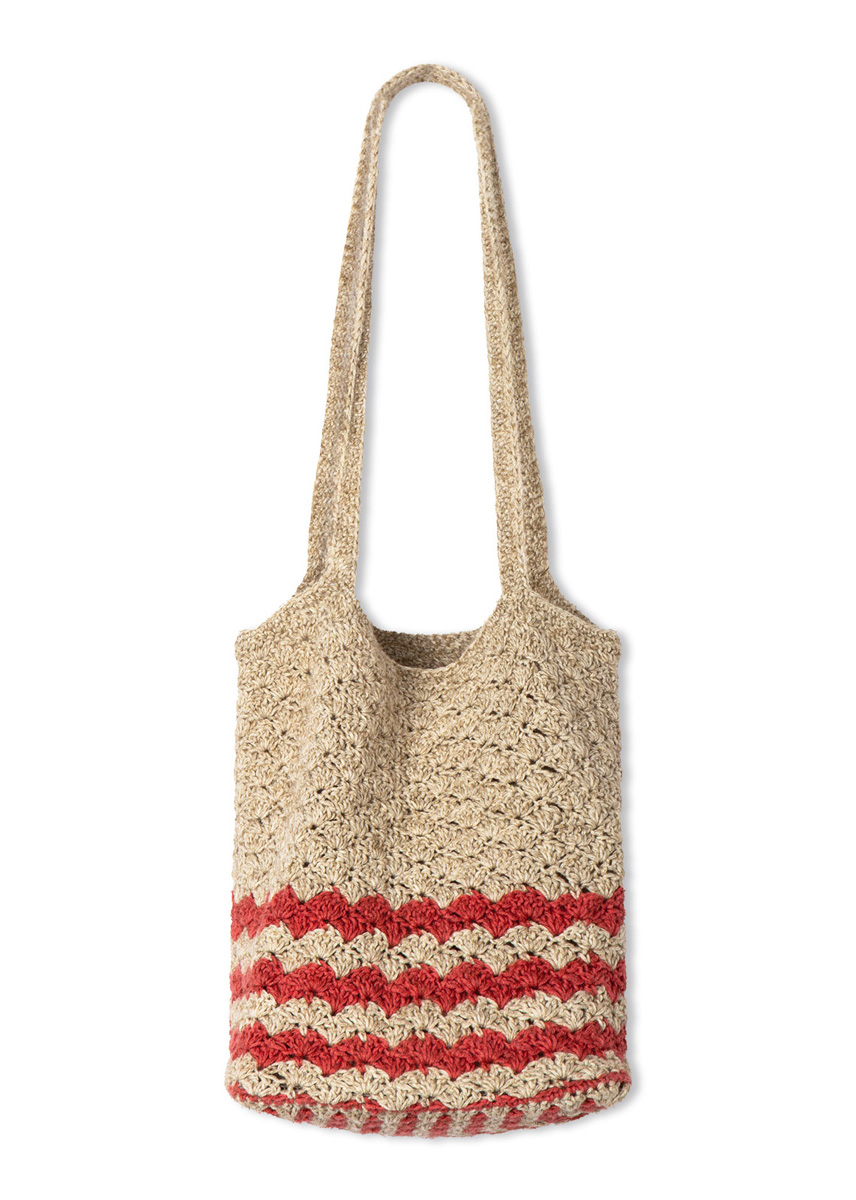 Lana Grossa-Qualität „Diversa” (74 % Baumwolle, 26 % Viskose, LL = ca. 210 m/50 g): ca. 100 g Beige (Fb. 30) und ca. 50 g Rostrot (Fb. 22); 1 Wollhäkelnadel Nr. 4; ca. 18 x 18 cm festere Pappe als Einlage für den Boden.