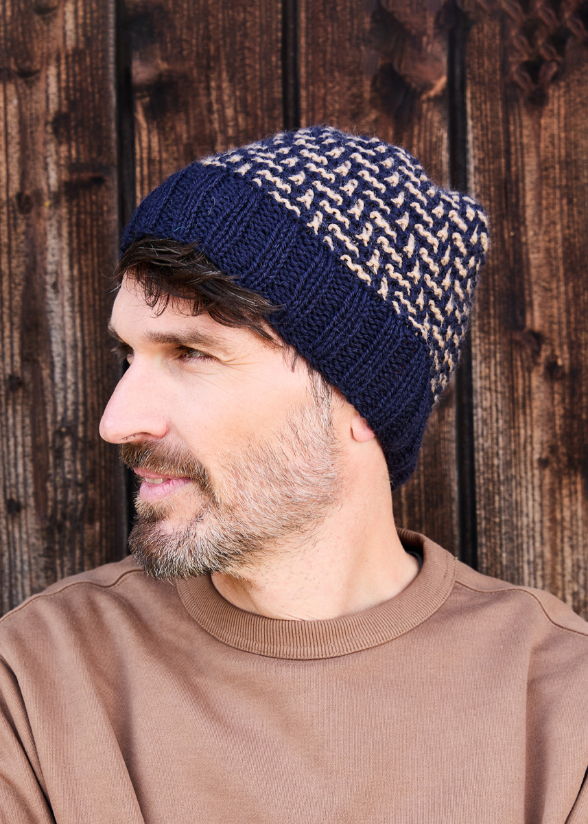 Lana Grossa-Qualität „Landlust-Naturwolle“ (100 % norwegische Schurwolle, LL ca. 85 m/50 g), je 50 g in Schwarzblau (Fb 5) und in Camel (Fb 16); 1 Rundstricknadel Nr. 5,5, 40 cm lang, 1 Nadelspiel Nr. 5,5.