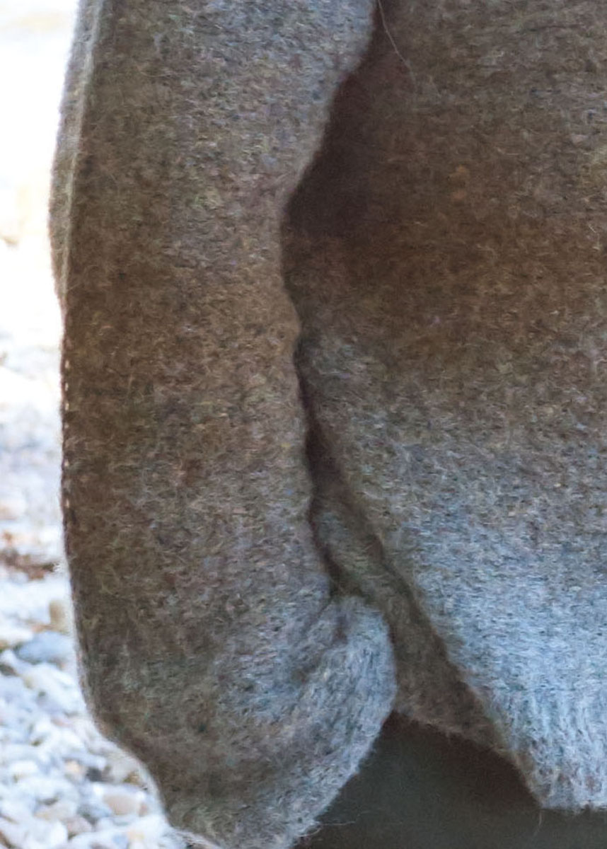 Lana Grossa-Qualität „Garzato Fleece Dégradé” (70 % (Baby) Alpaka, 30 % Polyamid, LL = ca. 225 m/50 g): ca. 250 (300 – 350) g Hellgrau/Khaki/Hellpetrol (Fb. 315); Stricknadeln Nr. 4 und 5, 1 Rundstricknadel Nr. 4, 50 cm lang.