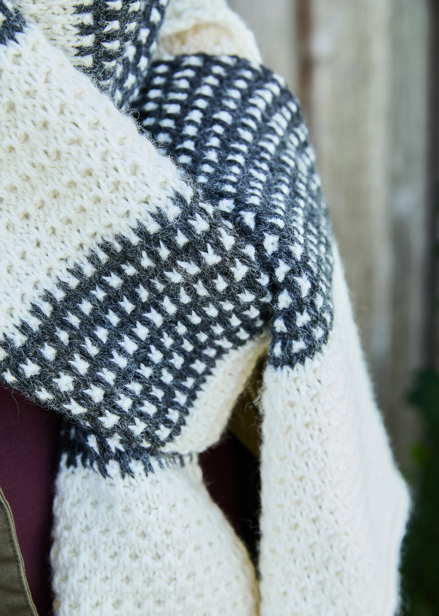 Lana Grossa-Qualität „Landlust- Naturwolle“ (100% Schurwolle, LL ca. 85 m/50 g), 350 g in Wollweiß (Fb 1) und 150 g in Anthrazit (Fb 10); Stricknadeln Nr. 5.