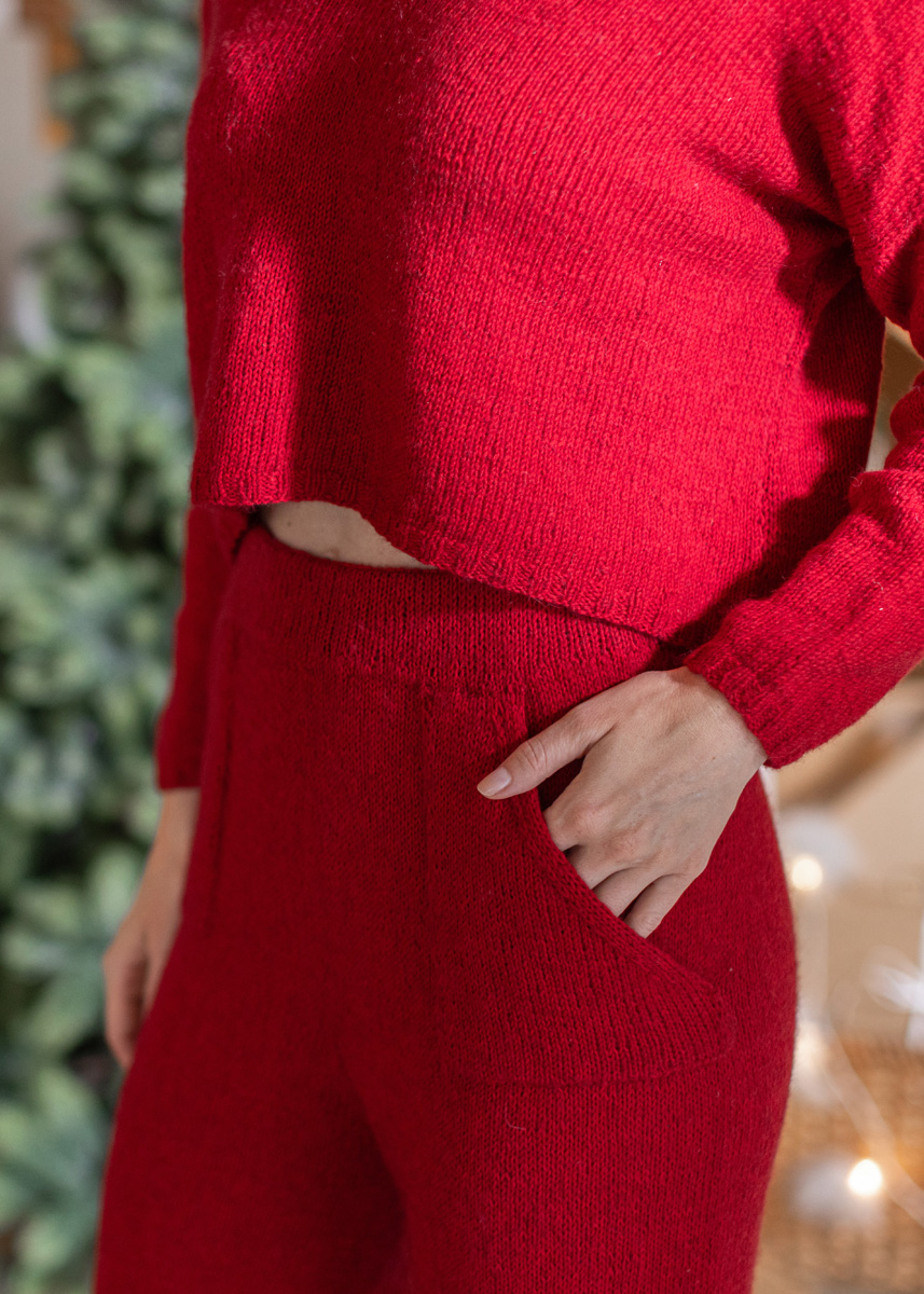 Die Hose wird in einem Stück von oben nach unten in Runden gestrickt. Die Taschen werden separat gestrickt und nachträglich aufgenäht.