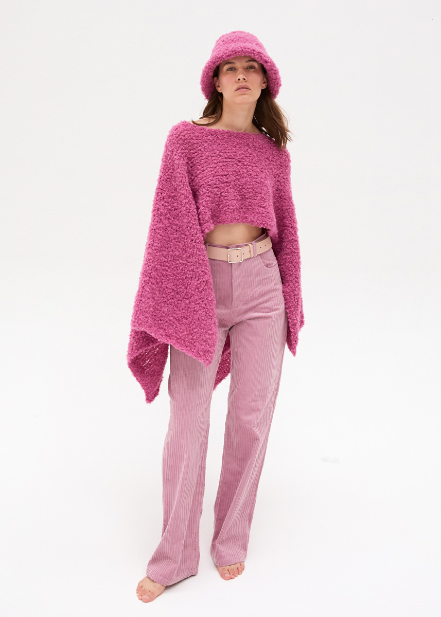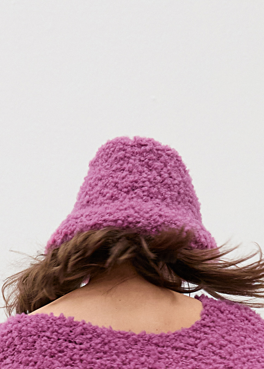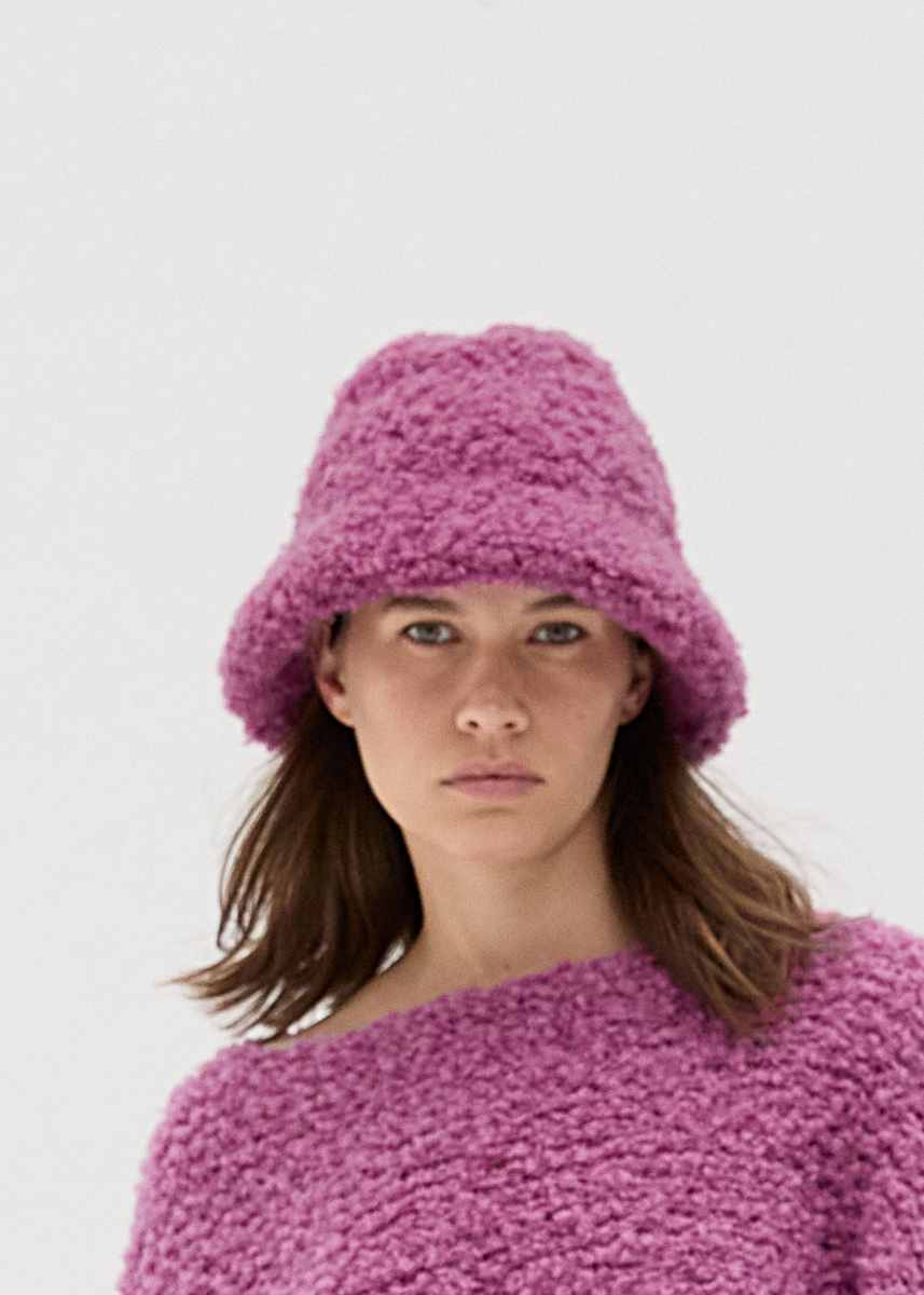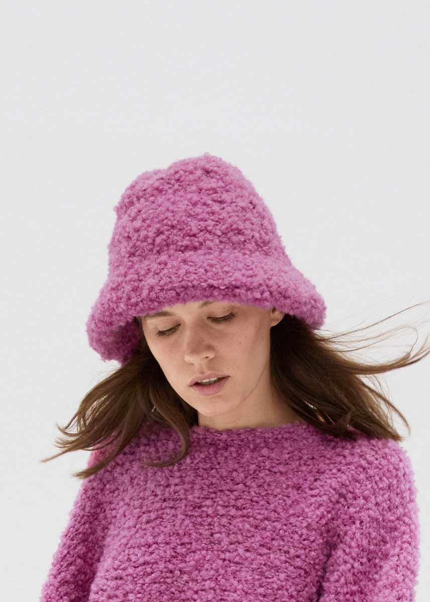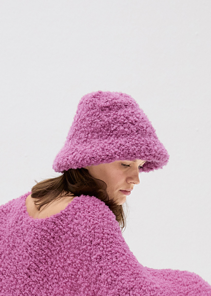 Lana Grossa „Orsetto“ (60% Schurwolle (Merino), 40% Alpaka (superfine), LL = 75 m/50 g): 100 g Veilchenrosa (Fb 4); Rundstrick-Nd und Nadelspiel Nr 8; Hilfs-Nd; Maschenmarkierer, Kontrastfaden.
