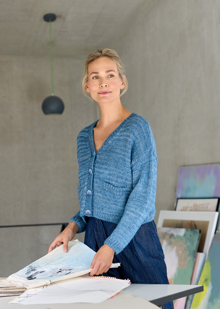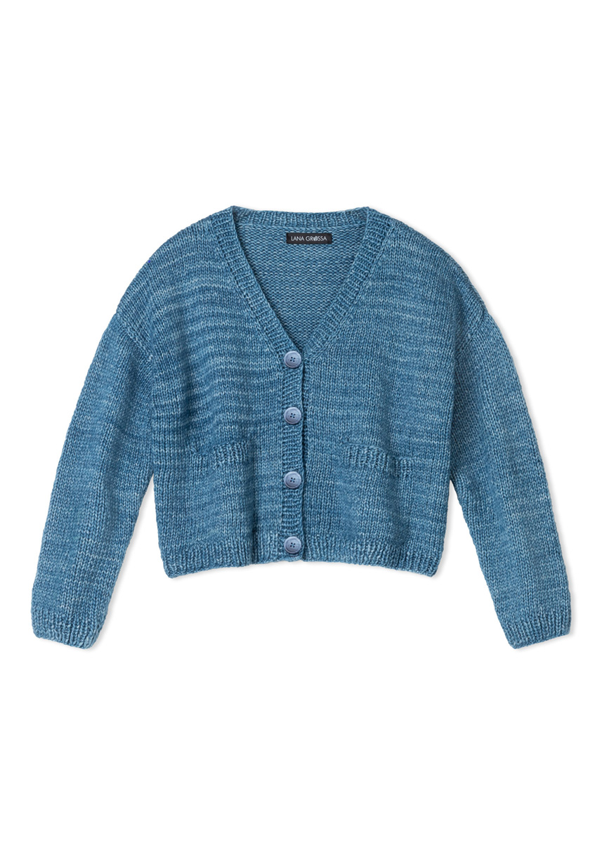 Lana Grossa-Qualität „Brihome 85 gitte No. 2 Vintage” (44 % Schurwolle (Merino), 37 % Baumwolle, 19 % Seide, LL = ca. 115 m/50 g): ca. 350 (400 – 450 – 500) g Blau meliert (Fb. 205); Stricknadeln Nr. 5,5 und 6, 1 Rundstricknadel Nr. 5,5, 100 cm lang; 4 Knöpfe von Union Knopf, Art. 13003, 25 mm ø, Fb. 661 blau meliert.