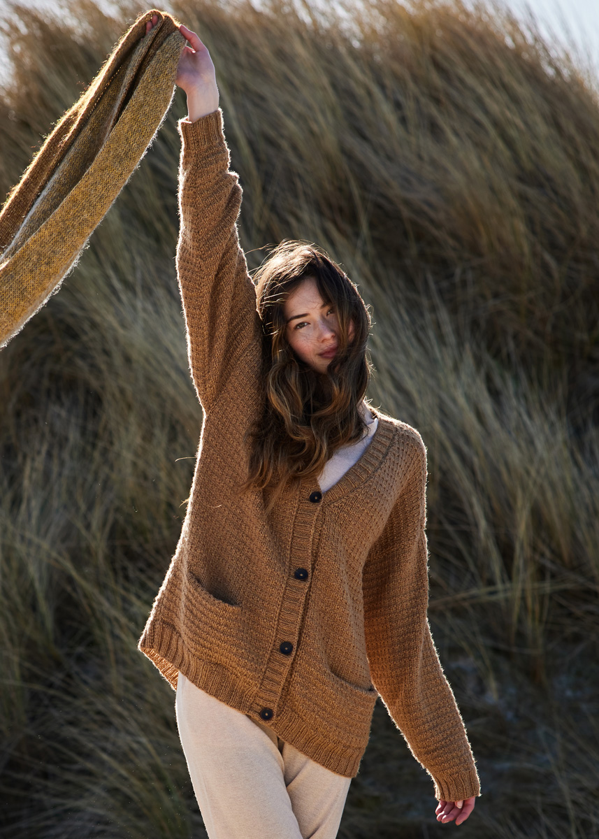 Lana Grossa-Qualität „Cool Merino“ (90 % Schurwolle (Merino), 10 % Polyamid, LL = ca 150 m/50 g): ca 500 (550 - 600) g Camel (Fb 11); Stricknadeln Nr 5 und 6; Häkelnadel Nr 5; 4 Knöpfe in Braun, 22 mm Durchmesser.