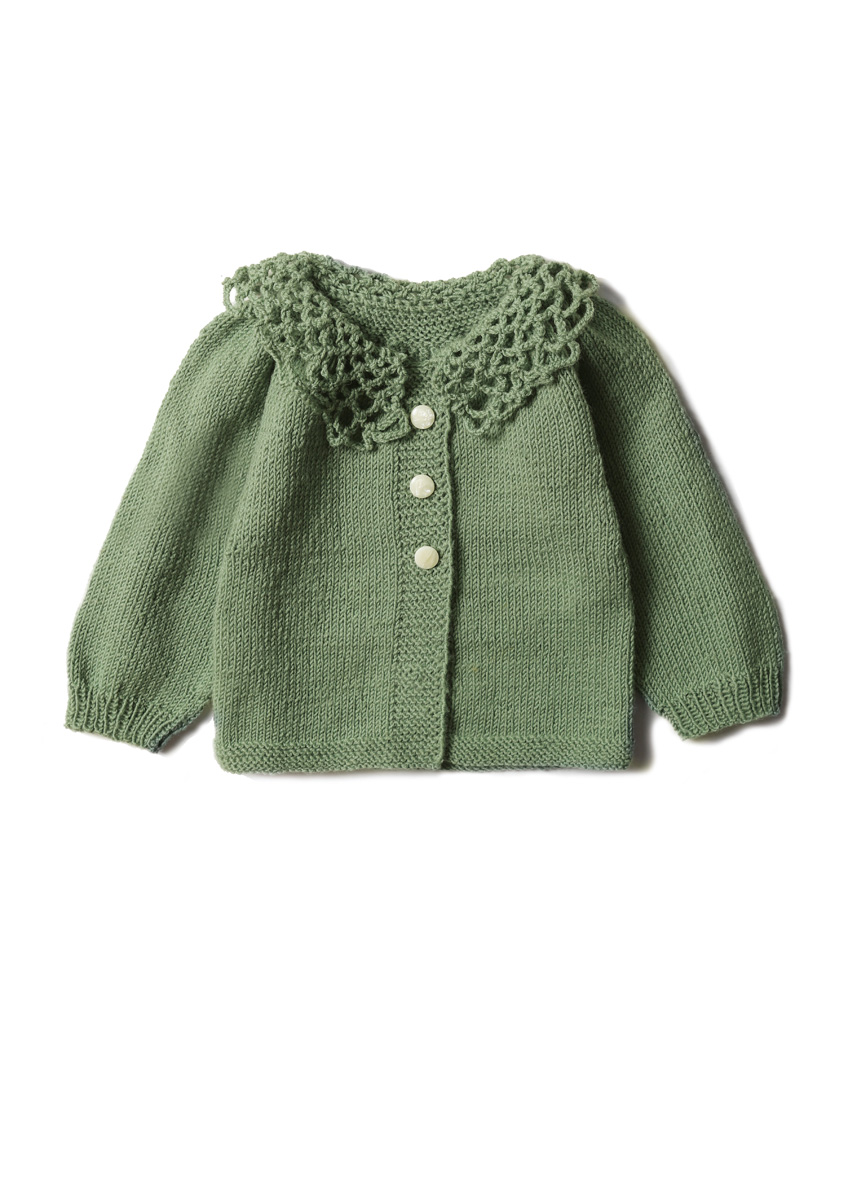 Lana Grossa Cool Wool Baby (100 % Schurwolle (Merino extrafine), Lauflänge = 220 m/50 g): 100 (100/150) g Resedagrün (Fb 297); Rundstricknadel Nr. 3; Nadelspiel Nr. 2,5 und Nr. 3; Häkelnadel Nr. 3; drei Knöpfe mit 13 mm Ø.