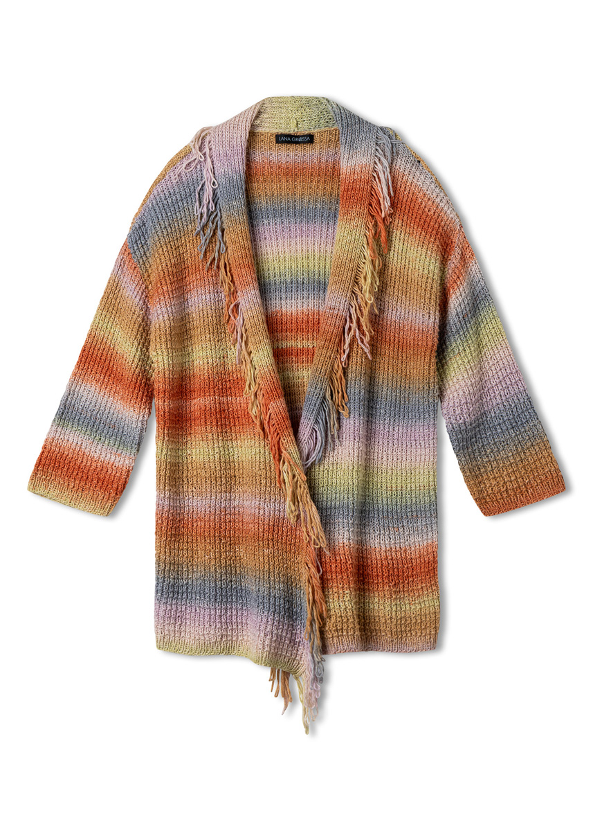 Dieses Traumteil vereint gleich zwei Top-Trends für 2026: Hippe Fransen zieren die Blenden und den Schalkragen dieser verschlusslosen Jacke, während die beliebten Farbverläufe diesen Sommer besonders weich und fließend daherkommen. Très jolie !