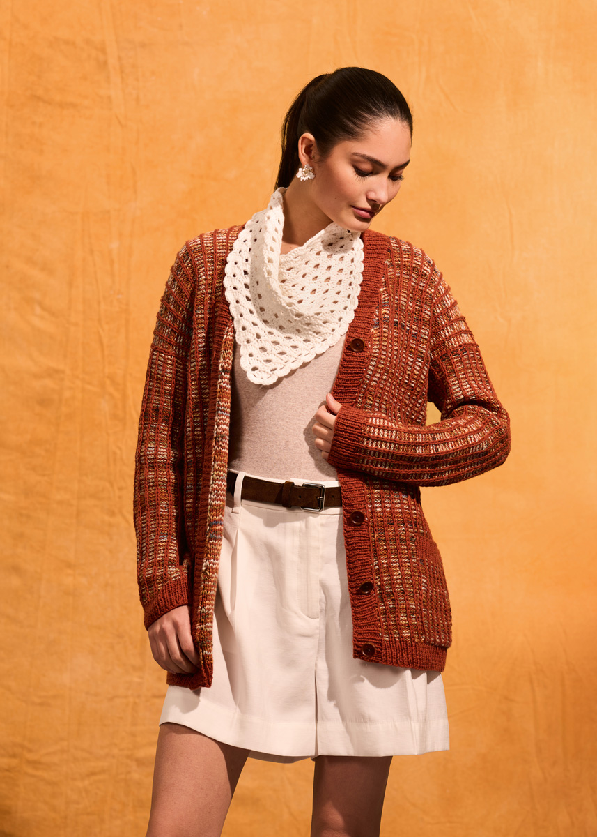Lana Grossa-Qualität „Cotonella“ (100 % Baumwolle (Pima), LL = ca 140 m/50 g): ca 6 (7 - 8 - 9) Knäuel = ca 300 (350 - 400 - 450) g Zimtbraun (Fb 204) und Lana Grossa-Qualität „Cotonella“ (75 % Baumwolle, 25 % Polyacryl, LL = ca 270 m/100 g): ca 2 (3 - 3 - 3) Knäuel = ca 200 (300 - 300 - 300) g Ocker/Beige/Hellblau/Jeans/Hell-/ Dunkelgrau bunt (Fb 114); Rundstricknadeln Nr 4 und Nr 4,5; 1 lange Rundstricknadel Nr 4; 5 Knöpfe in Braun Fb 22 Durchmesser 23 mm von Union Knopf Artikel-Nr 49493.