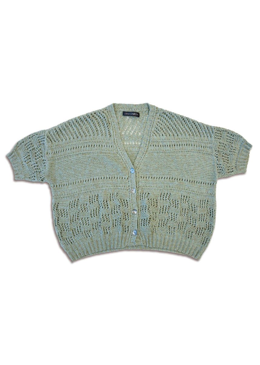 Lana Grossa-Qualität „Diversa“ (74 % Baumwolle, 26 % Viskose, LL = ca. 210 m/50 g): ca. 250 (300) g in Mint (Fb. 9); Stricknadeln Nr. 3 und Nr. 4,5, 1 Rundstricknadel Nr. 3, 120 cm lang; 4 Perlmutt-Knöpfe von Union Knopf, 18 mm Ø, Fb. 76, Art. 46286.