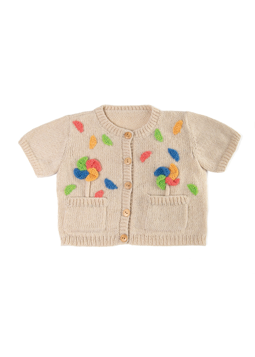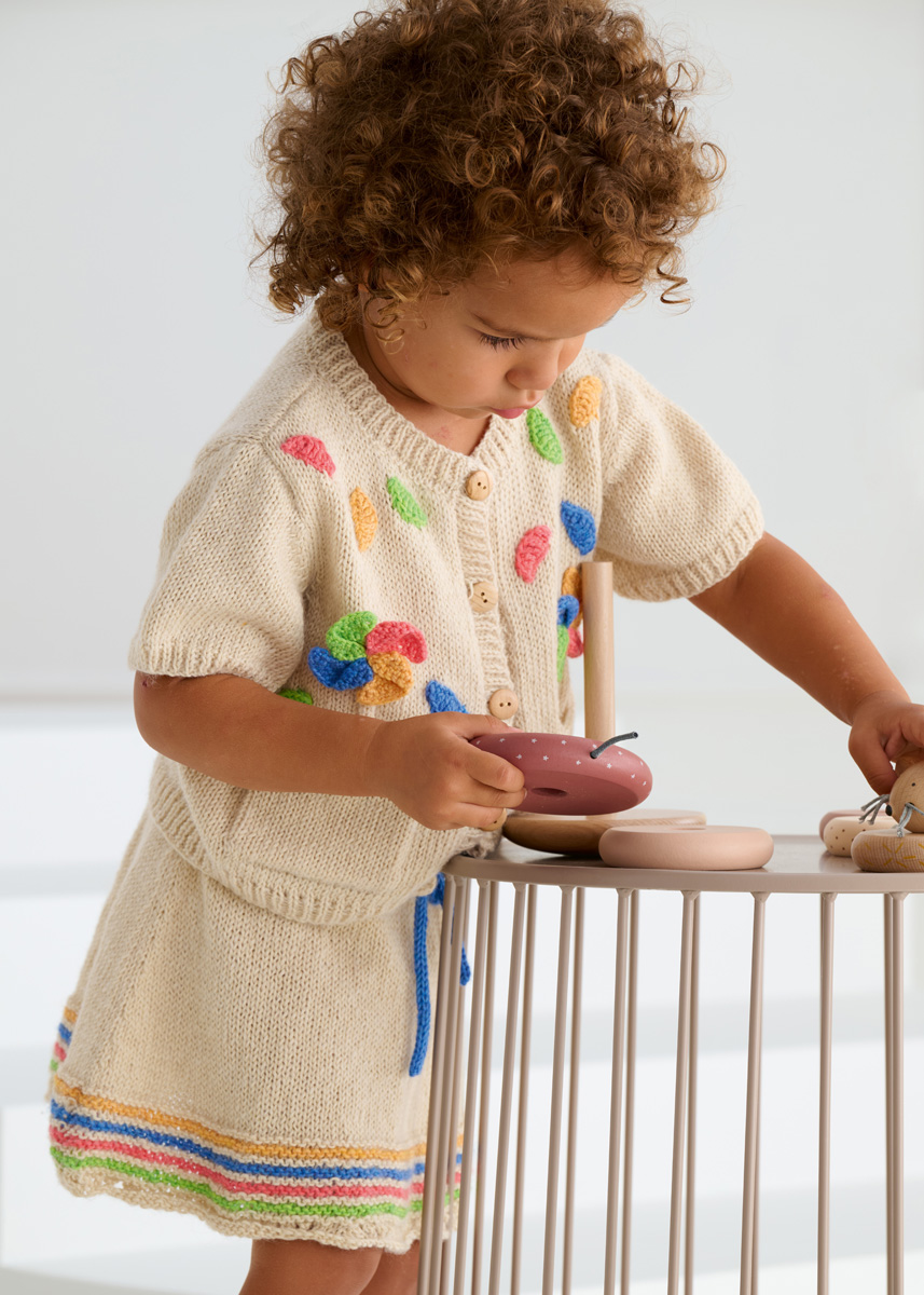 Lana Grossa Ecopuno (72% Baumwolle, 17% Schurwolle (Merino), 11% Alpaka (Baby); LL = 215 m/50 g): 100 (100/100/150) g Perlbeige (Fb. 66) und je 50 g Frühlingsgrün (Fb. 215), Enzianblau (Fb. 213), Hummer (Fb. 90) und Safrangelb (Fb. 216); je eine Rundstricknadel 3,5 mm und 4 mm; eine Häkelnadel 3 mm; Maschenmarkierer; 5 Knöpfe mit 18 mm Ø.