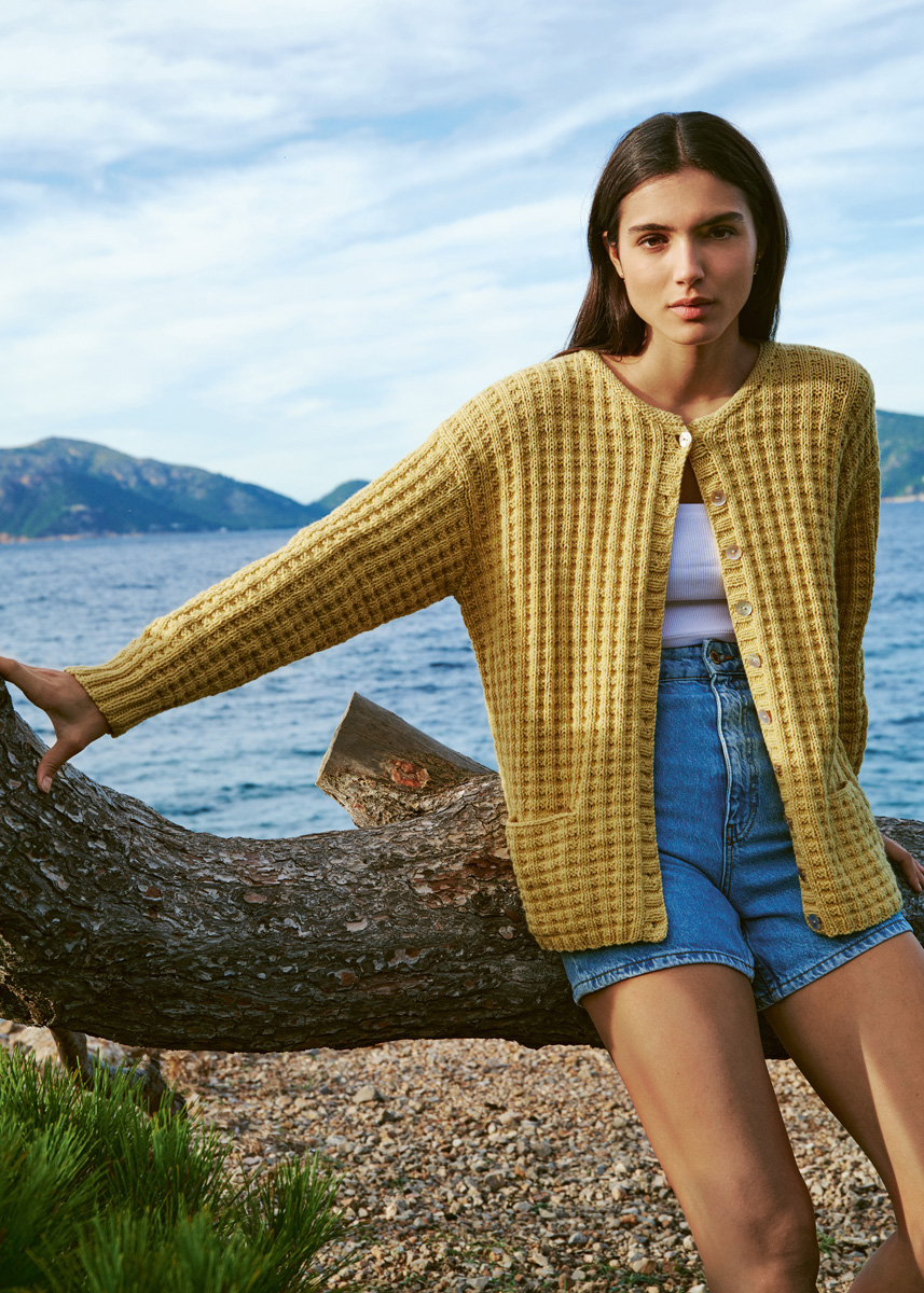 Lana Grossa-Qualität „Fourseason” (45 % (Bio) Schurwolle (Merino extrafine), 40 % (Bio) Baumwolle, 15 % rec. Kaschmir, LL = ca. 105 m/50 g): ca. 600 (650 – 700) g Gelb (Fb. 8); Stricknadeln Nr. 4 und 4,5, 1 Rundstricknadel Nr. 4, 80 cm lang; 10 Perlmuttknöpfe in Natur, ø 18 mm.