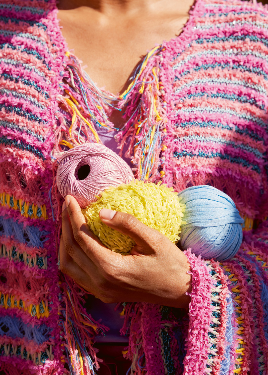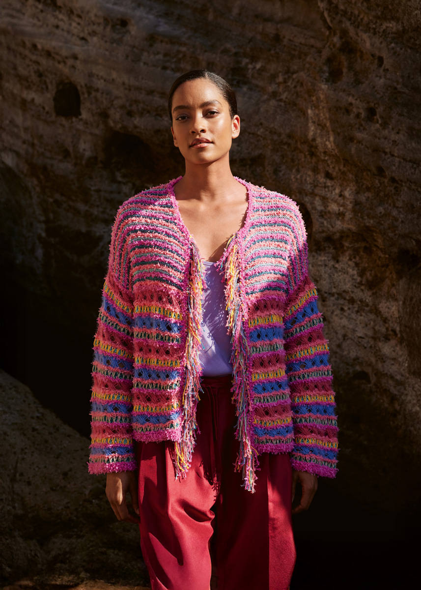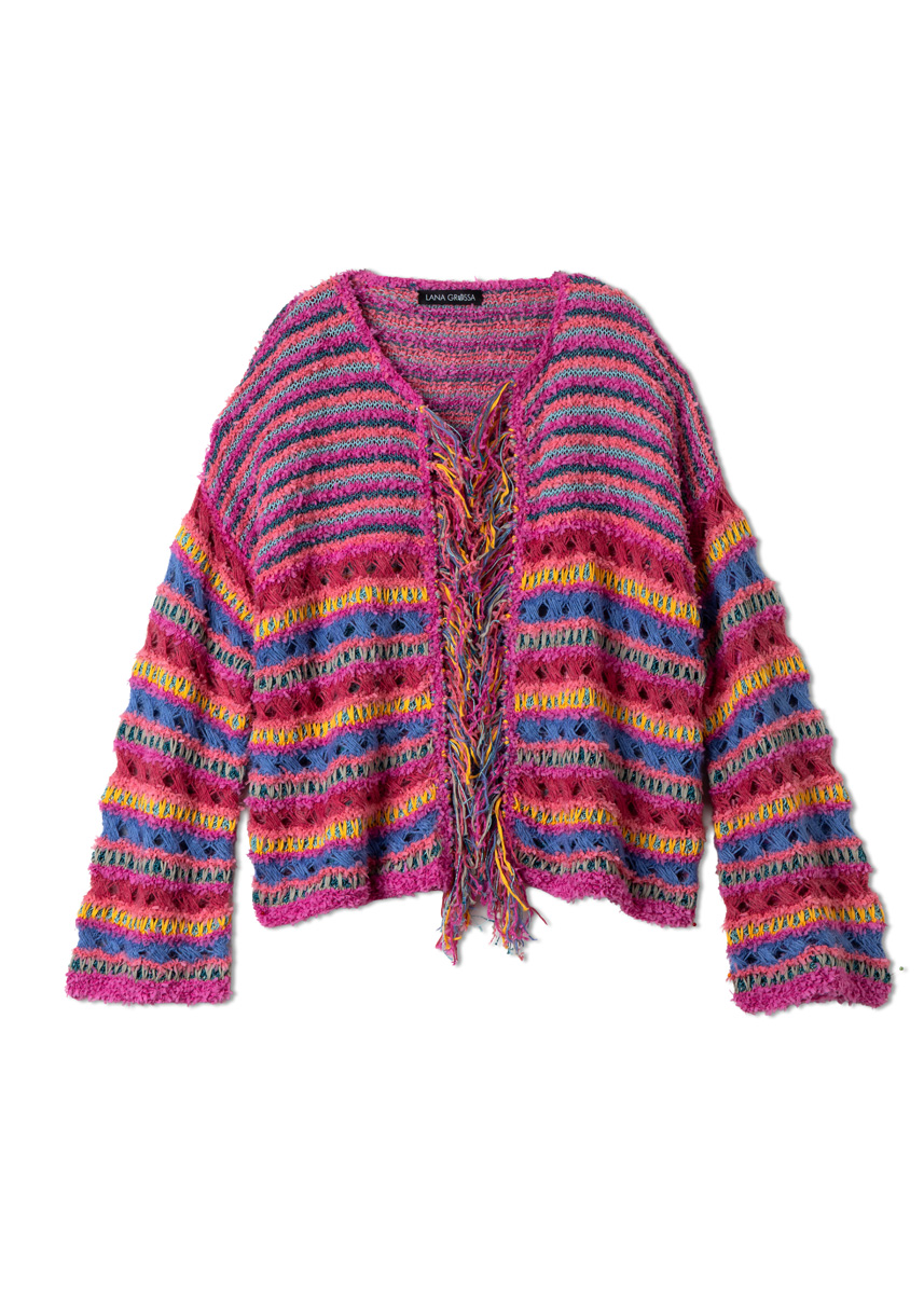 Non plus ultra = Fransen plus Glitzer! In diesem Prachtstück verbinden sich Muster, Garne und Farben so gekonnt, dass die verschlusslose Jacke zu einem Must-have wird – und das weit über den Sommer hinaus.