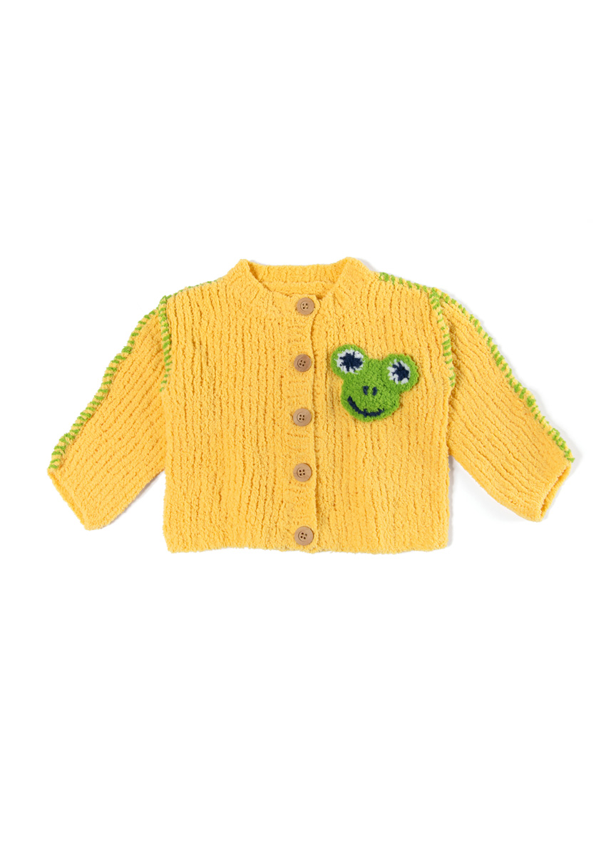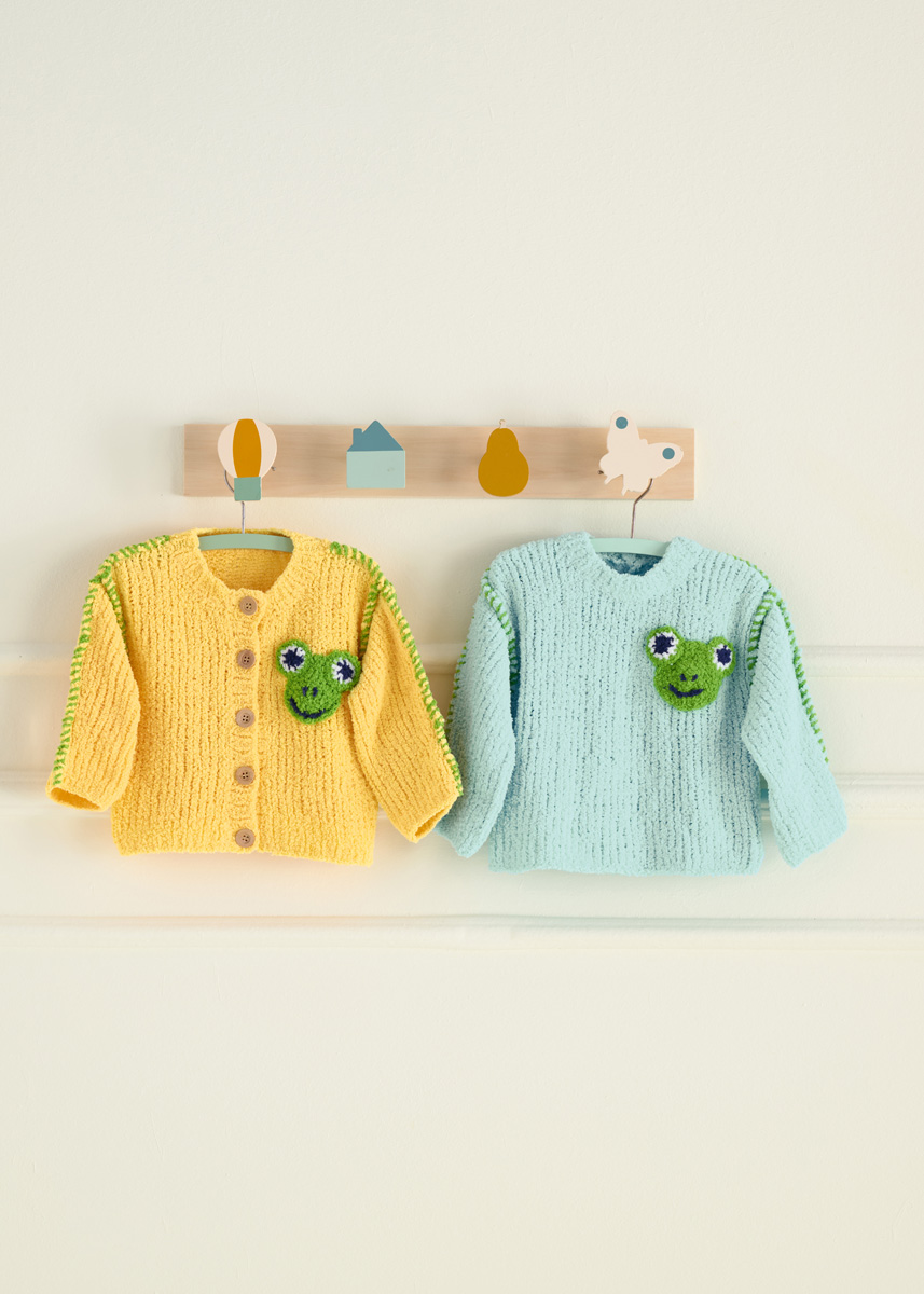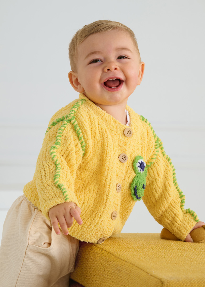 Lana Grossa Leggerissimo (100% rec. Polyamid); LL = 150m/50 g): 50 (100/100/150) g Gelb (Fb. 1) und je 50 g Frühlingsgrün (Fb. 12), Weiß (Fb. 17) und Nachtblau (Fb. 14); je eine Rundstricknadel 4 mm und 4,5 mm; eine Häkelnadel 3,5 mm; Maschenmarkierer; 4 (5/5/5) Holzknöpfe mit 18 mm Ø.