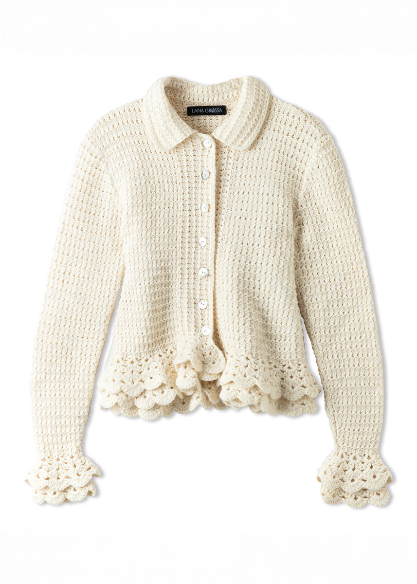 Lana Grossa-Qualität „Summer Softness“ (80 % Baumwolle (Bio), 20 % Schurwolle (Merino superfine), LL = ca 130 m/50 g): ca 500 (550 - 600 - 650) g Creme (Fb 2); Stricknadeln Nr 4,5; Häkelnadel Nr 6; 7 Perlmuttknöpfe, Durchmesser 20 mm.